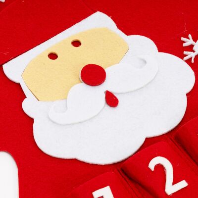Dekorativní adventní kalendář s motivem Santy přinese dětem radostné očekávání Vánoc. Nástěnný kalendář obsahuje 24 kapsiček na drobné dárky, sladkosti nebo milé vzkazy. Vyroben z přírodních materiálů, doplněn o praktickou stuhu na zavěšení. Skvěle se hodí jako vánoční dekorace do dětského pokoje i obývacího prostoru. Šířka 37 cm, výška 60 cm, rozměry kapsičky 3,5x4,5 cm.