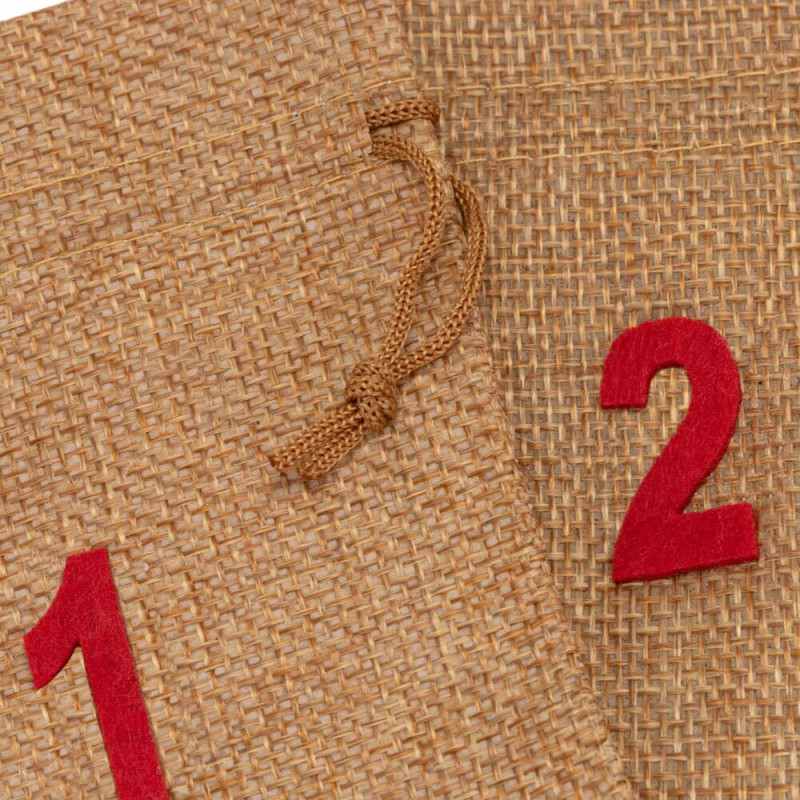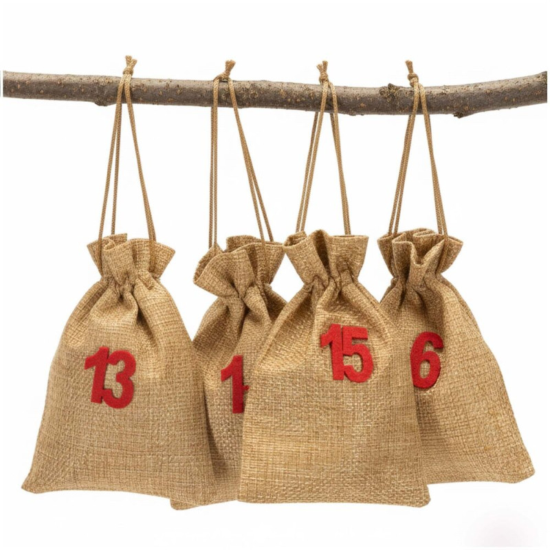 Sada 24 jutových sáčků s čísly od 1 do 24 je ideální pro vytvoření vlastního adventního kalendáře. Každý sáček má praktickou stahovací šňůrku a rozměry 10×15 cm, takže se do něj snadno vejdou drobné dárky, sladkosti nebo vzkazy. Sáčky můžete zavěsit nebo rozmístit podle fantazie a opakovaně je použít jako stylovou dekoraci.