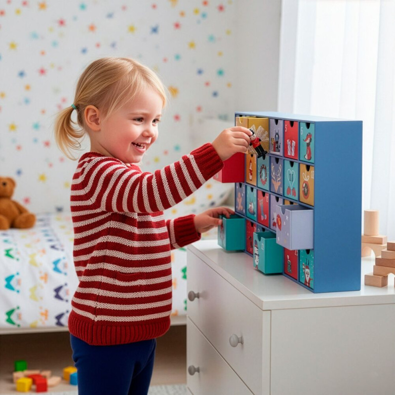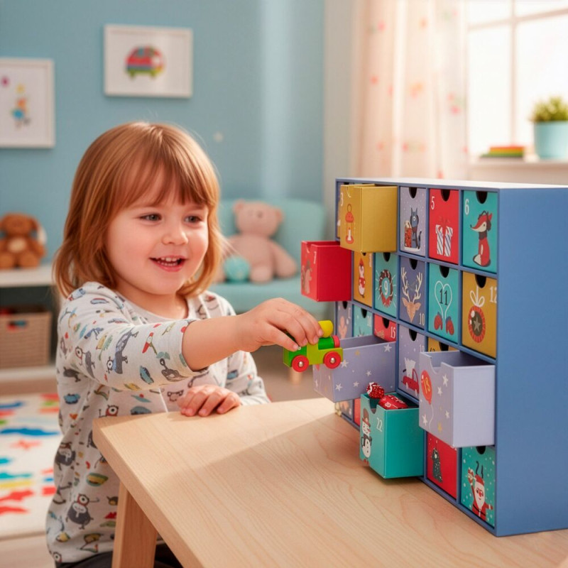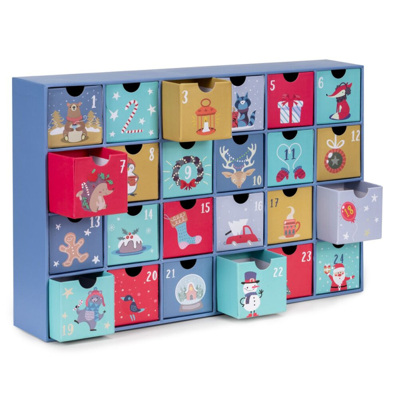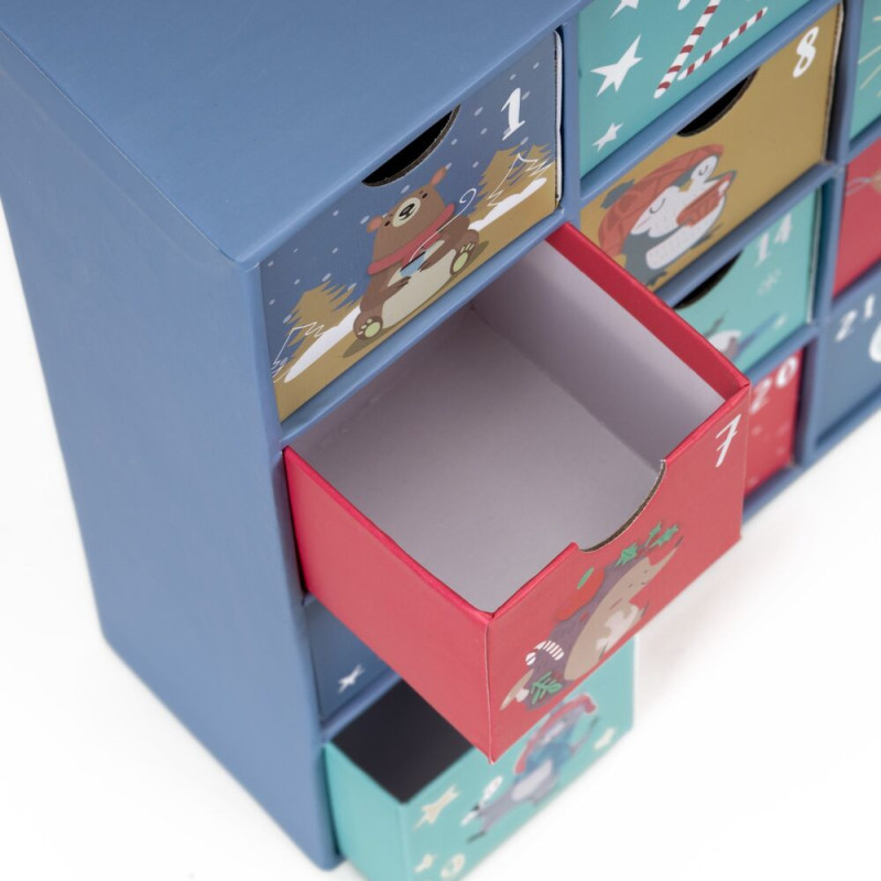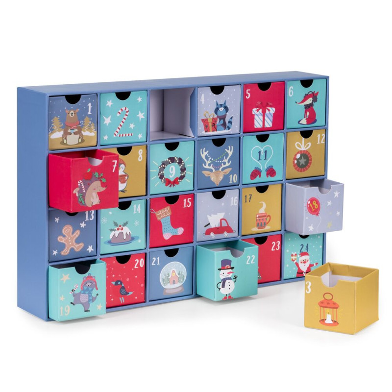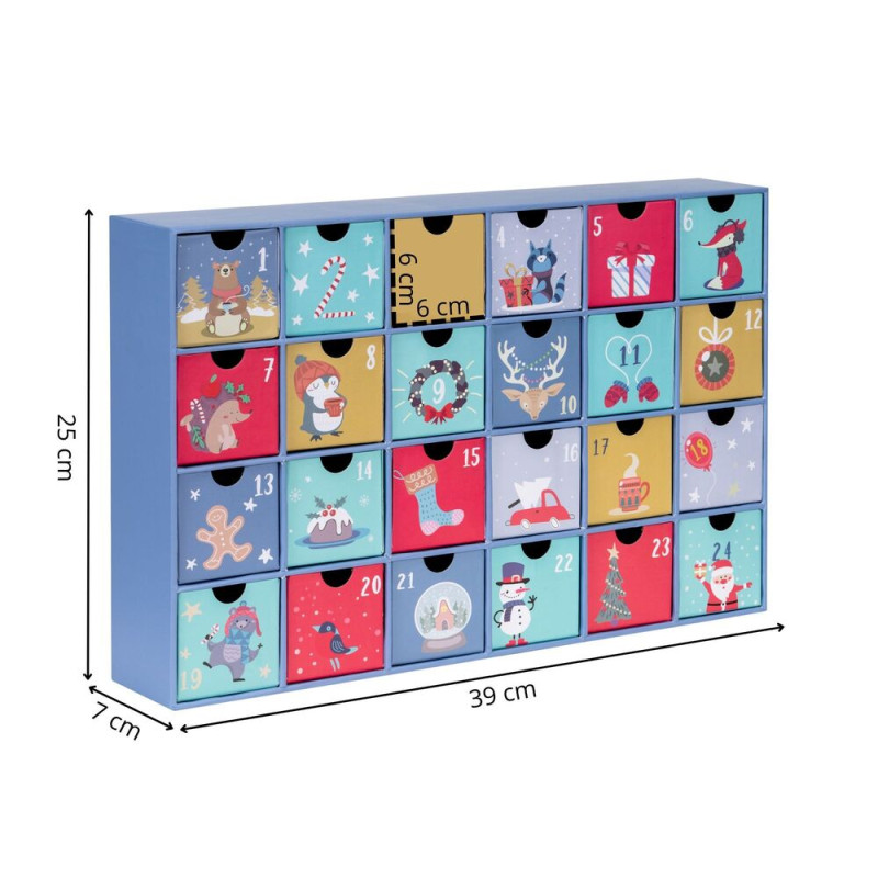 Dětský adventní kalendář s 24 boxy ozdobenými barevnými vánočními motivy promění čekání na Vánoce v každodenní radost. Do každého boxu lze vložit malé dárky, sladkosti nebo vzkazy, které dětem přinesou úsměv každý den. Originální dekorace, která podporuje tradici adventu a rozzáří každý dětský pokoj. Celkové rozměry 39×25 cm.
