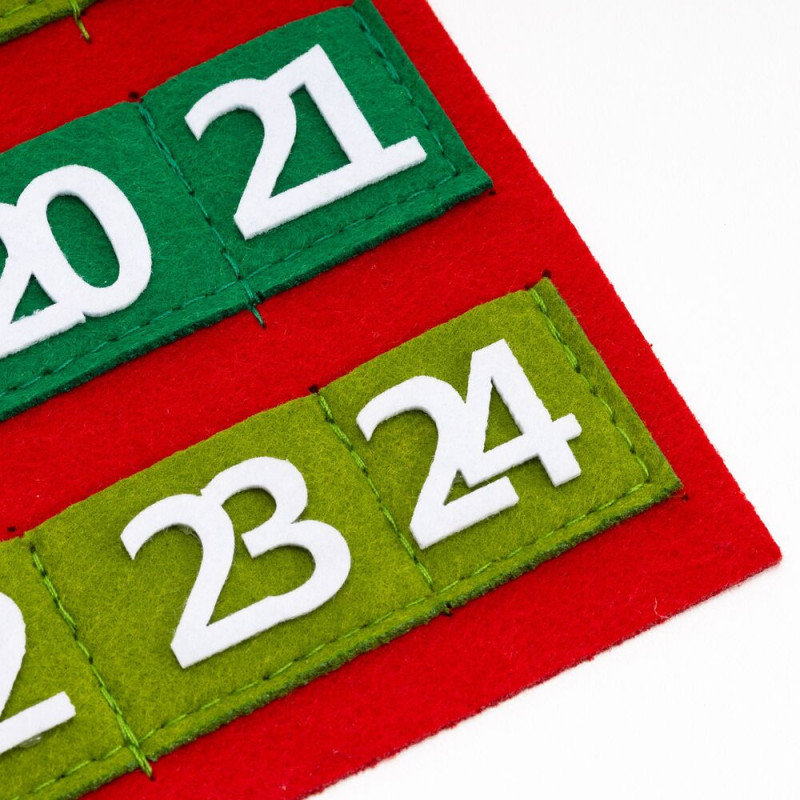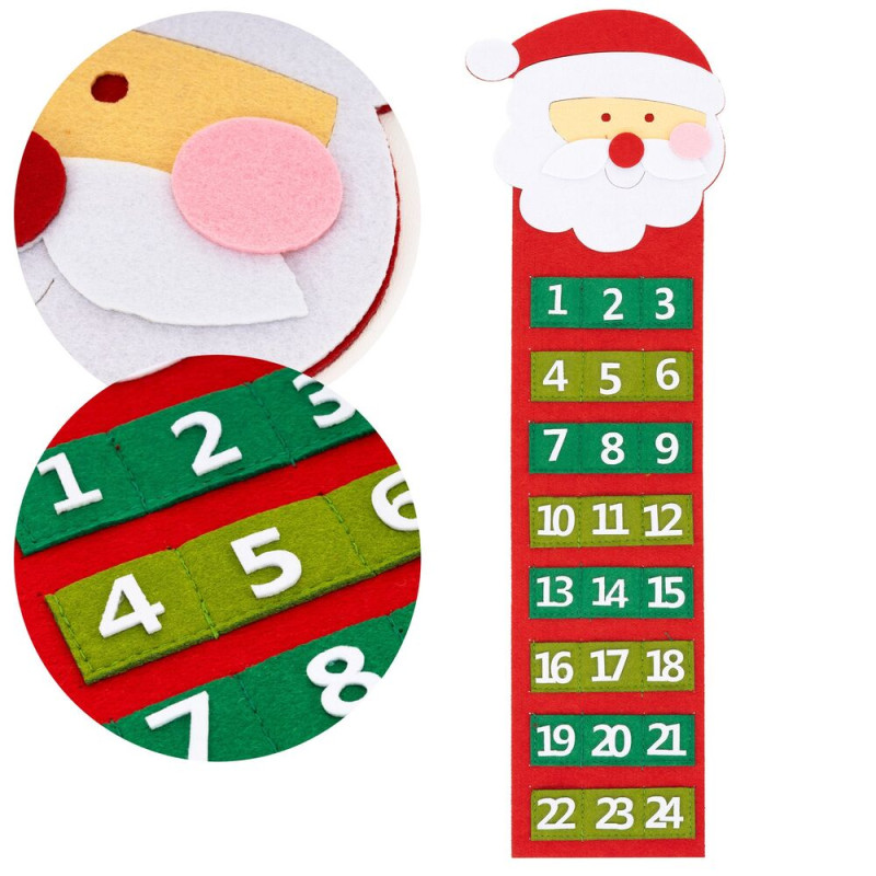 Dekorativní adventní kalendář s motivem Santy přinese dětem radostné očekávání Vánoc. Nástěnný kalendář obsahuje 24 kapsiček na drobné dárky, sladkosti nebo milé vzkazy. Vyroben z přírodních materiálů, doplněn o praktickou stuhu na zavěšení. Skvěle se hodí jako vánoční dekorace do dětského pokoje i obývacího prostoru. Šířka 20 cm, výška 63,5 cm, rozměry kapsičky 3,5x3 cm.