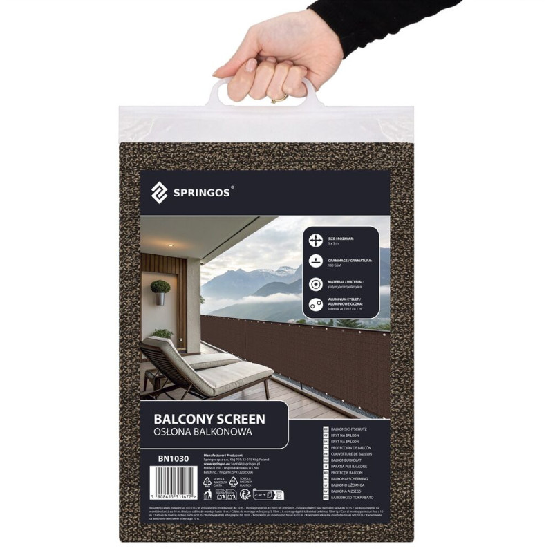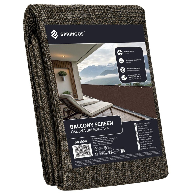 Zástěna na balkon 1x5 m SPRINGOS BN1030 hnědá je praktický doplněk, který pomůže vytvořit příjemnější a chráněnější prostor na balkoně i terase. Poskytuje 95% zastínění, díky kterému účinně omezuje nežádoucí pohledy z okolí a zvyšuje pocit soukromí při každodenním odpočinku.
