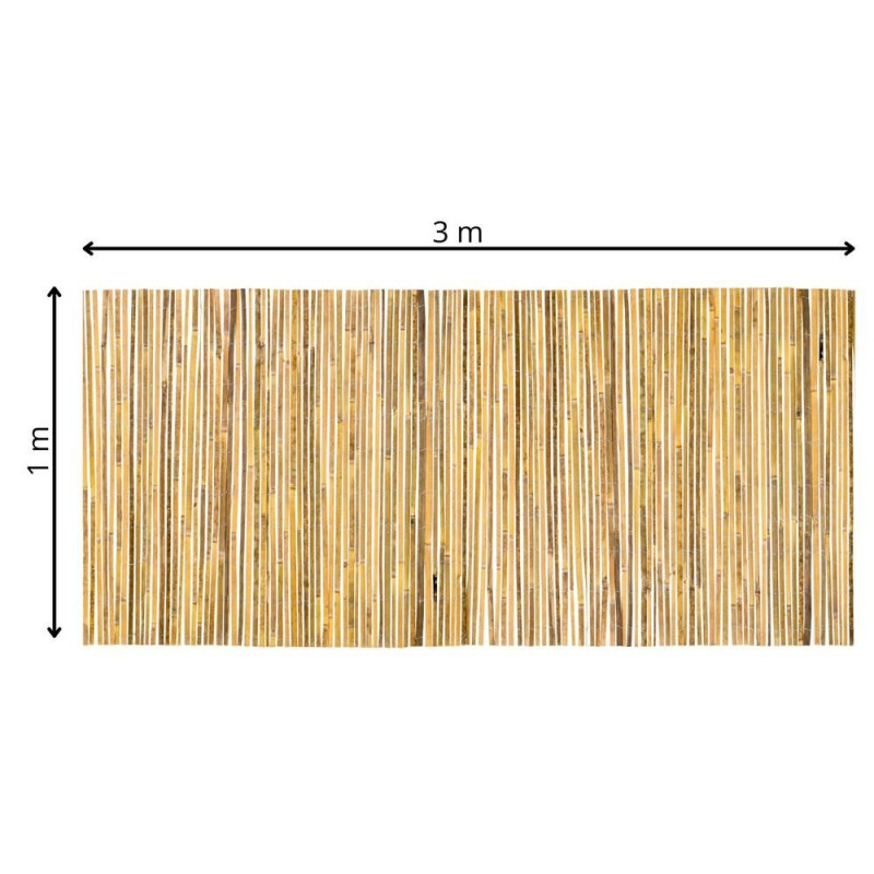 Přírodní bambusová zástěna z pevných lamel, hustým uspořádáním a vyztužením pozinkovaným drátem každých 10 cm. Zajišťuje soukromí, zastínění a zároveň umožňuje přirozené proudění vzduchu. Vhodná na ploty, balkony i terasy, pro oddělení prostoru nebo zakrytí nevzhledných míst. Výška 1 m, délka 3 m.