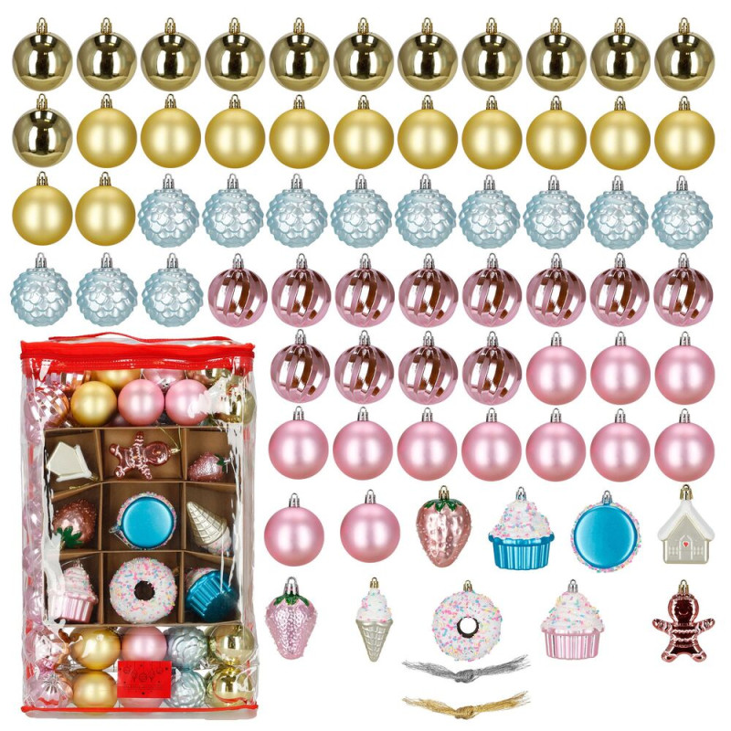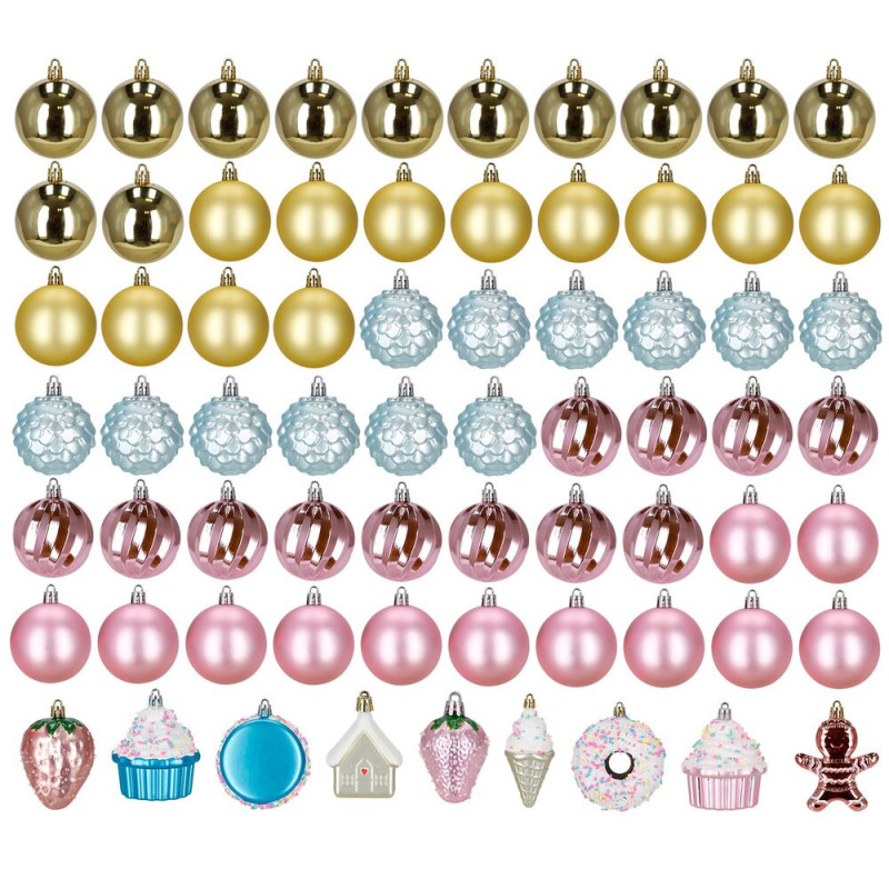 Vánoční baňky barevné mix – sada 70 ks, vánoční ozdoby přinášejí hravou, pestrou a originální atmosféru, která rozzáří každý vánoční stromeček i celou sváteční výzdobu. Tato bohatá sada kombinuje klasické koule s jedinečnými ozdobami ve tvaru sladkostí, domečků či dalších vánočních motivů, což vytváří veselý a poutavý vizuální efekt. Všechny ozdoby jsou vyrobeny z nerozbitného plastového materiálu, díky čemuž jsou lehké, bezpečné a odolné. Každý kus je navíc doplněn praktickým poutkem pro zavěšení, které usnadňuje dekorování.
