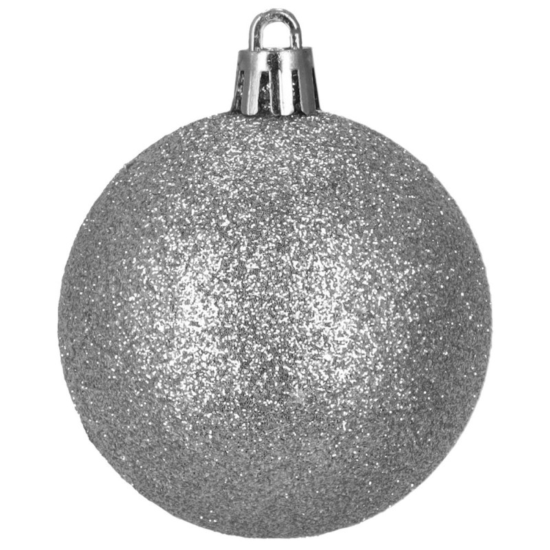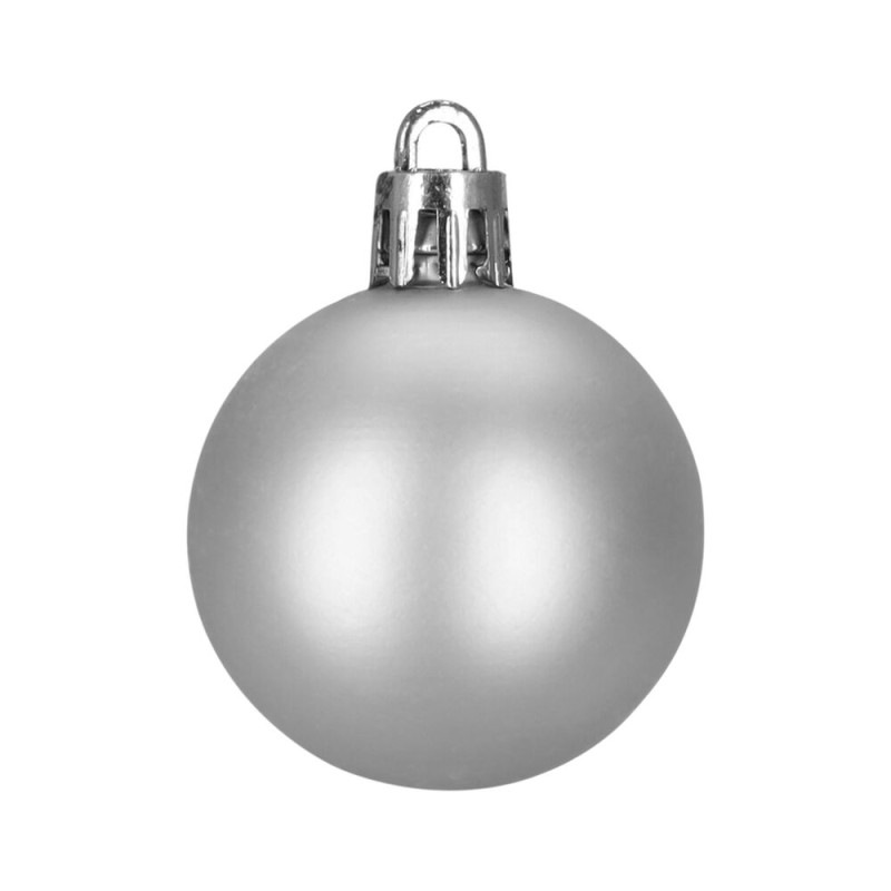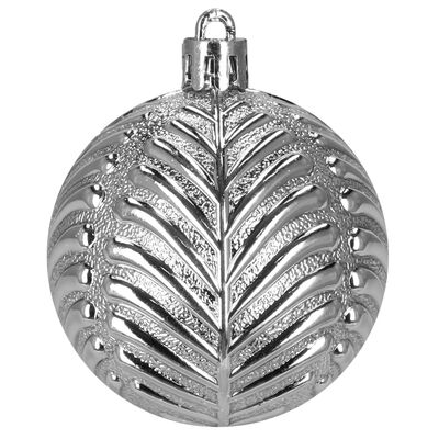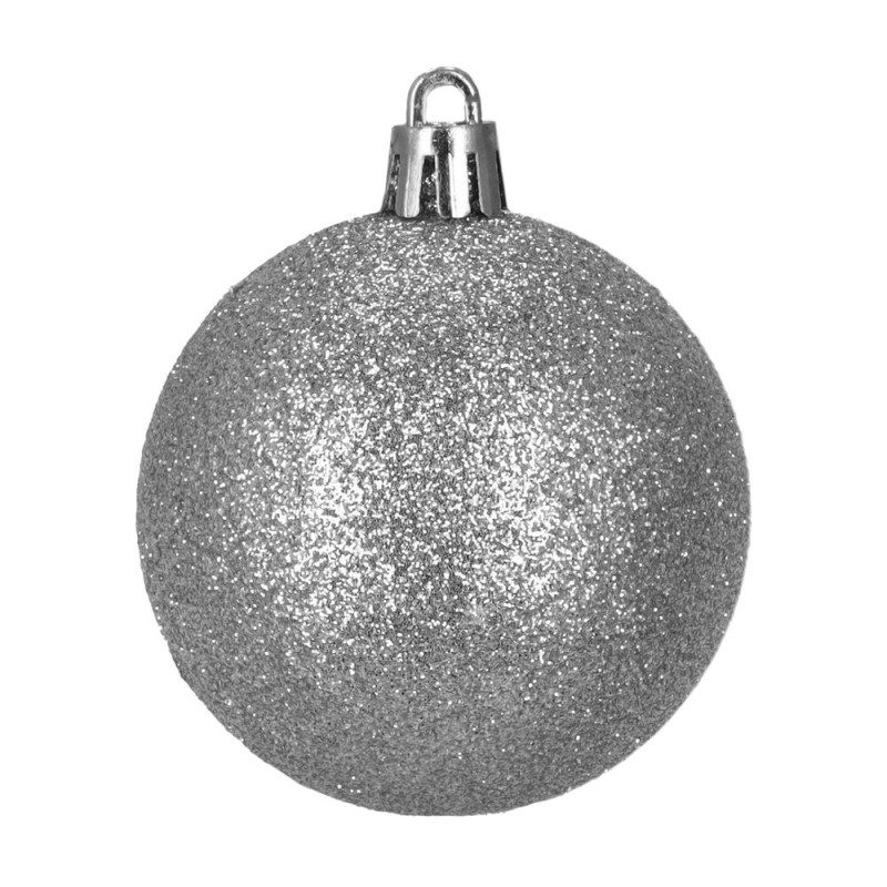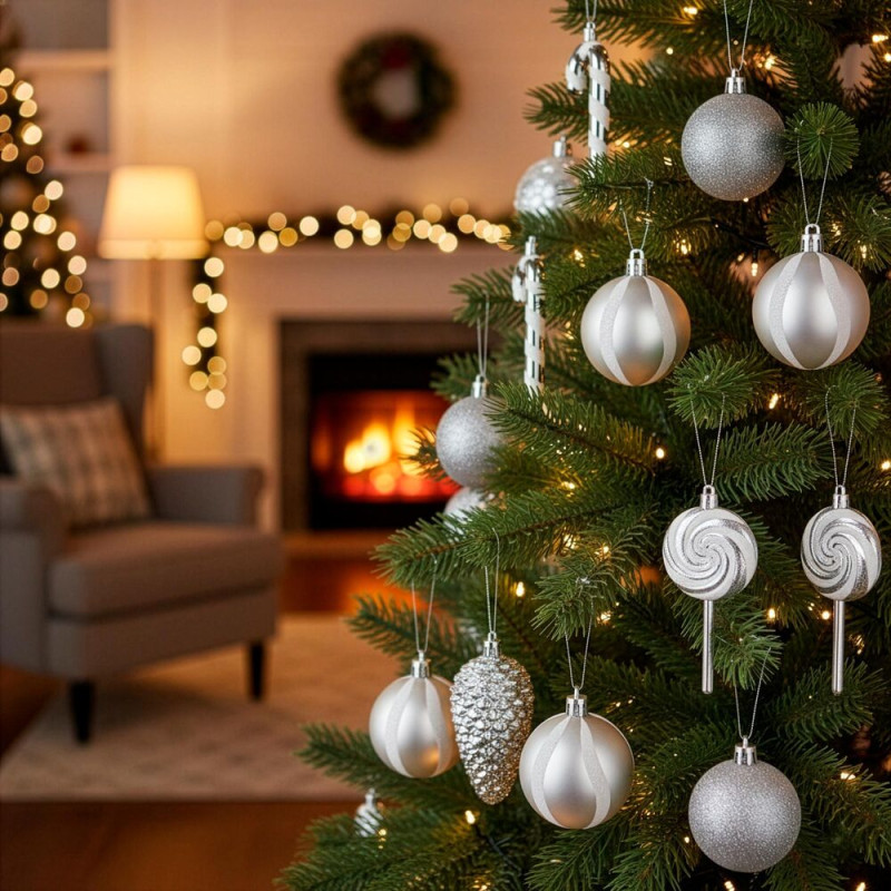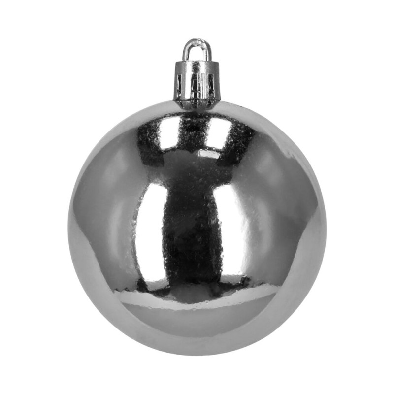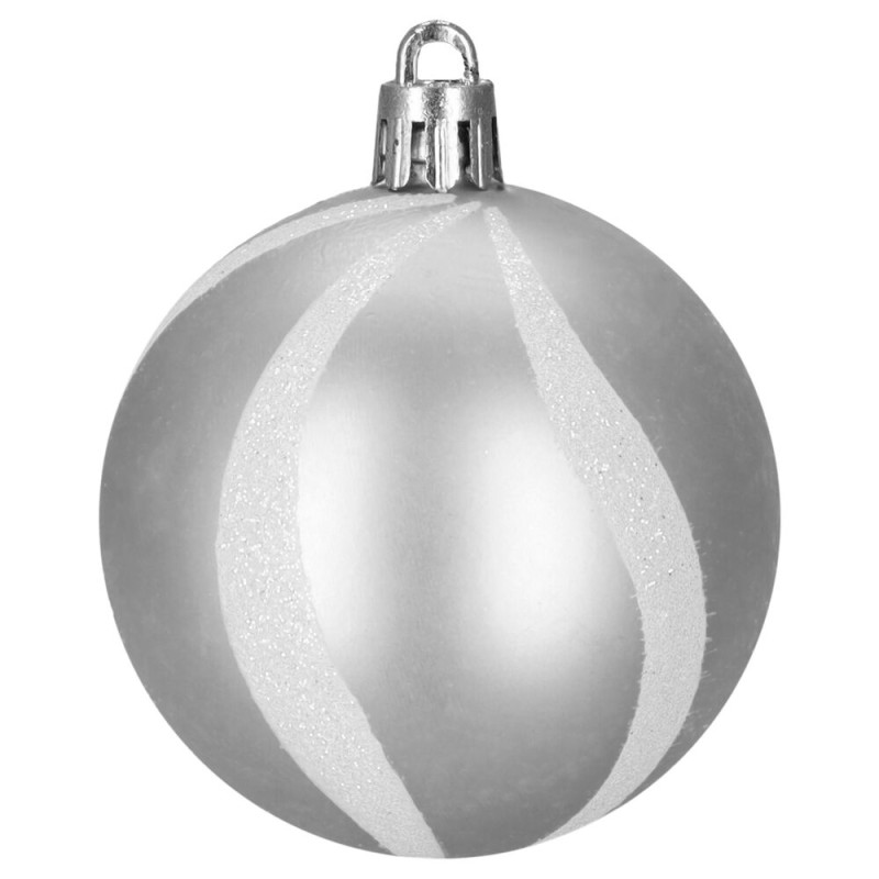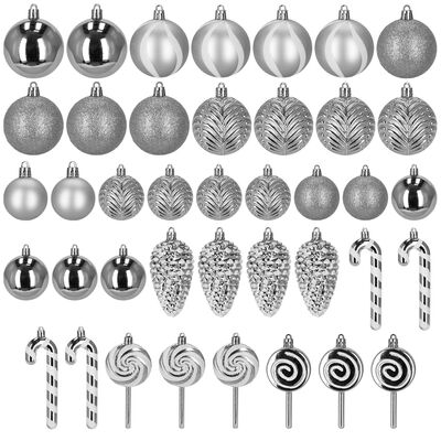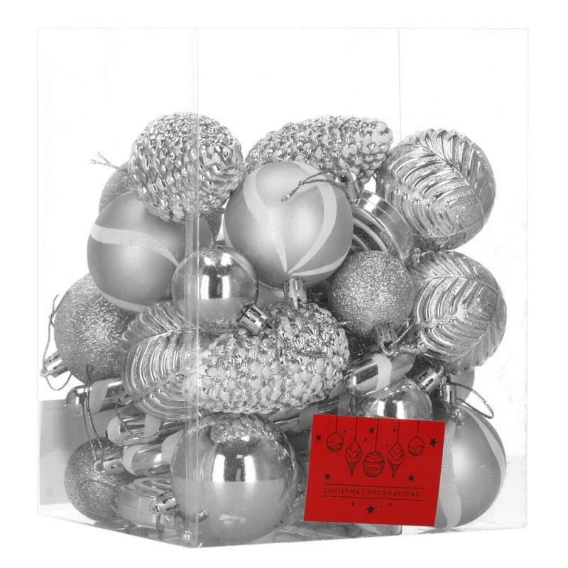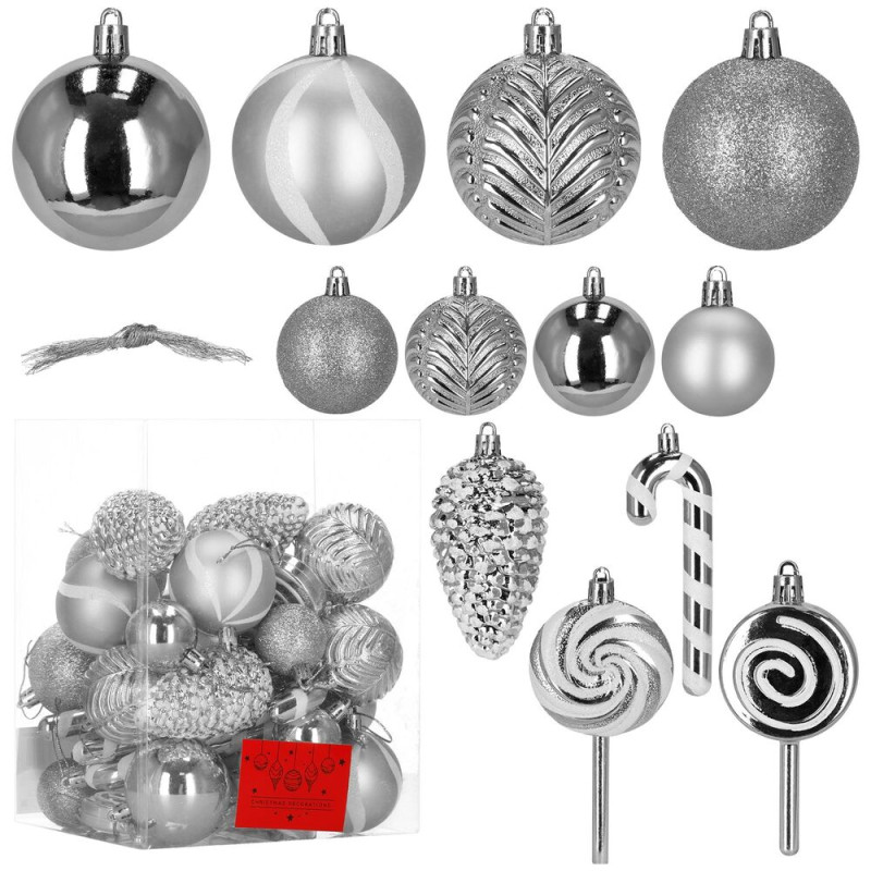 Sada stříbrných vánočních ozdob v různých tvarech a provedeních dodá výzdobě moderní, elegantní a zimní vzhled. Obsahuje lehké, nerozbitné plastové koule, šišky i ozdoby ve tvaru lízátek a cukrátek, vše s poutky pro snadné zavěšení. Vhodné na stromeček i jako dekorace do interiéru či exteriéru. Průměry koulí: 4 cm, 5 cm a 6 cm.