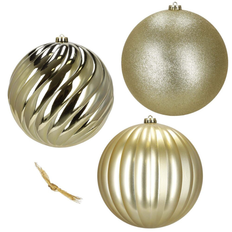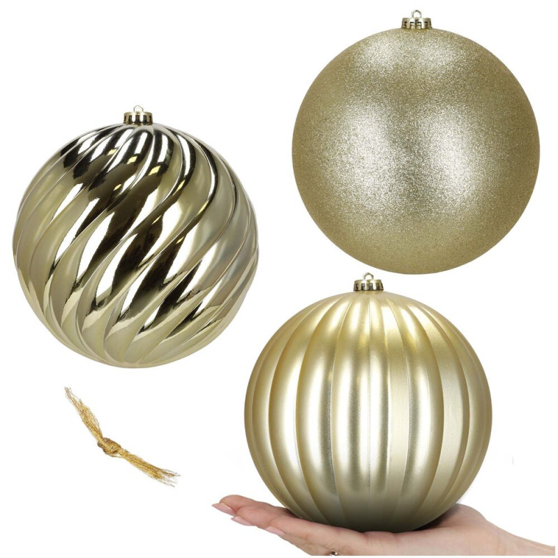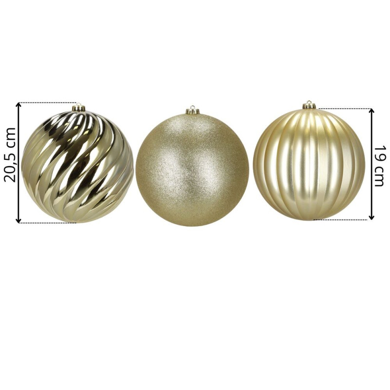Vánoční baňky zlaté mix – 20 cm sada 3 ks představují elegantní sadu dekorací, které dodají každé vánoční výzdobě luxusní a slavnostní atmosféru. Každá koule v sadě má jedinečnou strukturu povrchu, díky čemuž působí moderně a atraktivně. Jsou vyrobeny z lehké a nerozbitné plastové hmoty, která zaručuje dlouhou životnost i bezpečné používání v domácnostech s dětmi či domácími mazlíčky.