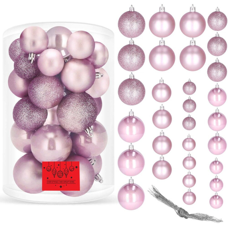 Sada 30 ks růžových baněk na stromeček se třemi různými vzory. Průměr baňky je 3,5/4,5/5,5 cm. Poutko na zavěšení, nerozbitný plastový materiál. Ideální k výzdobě stromečku nebo jako vánoční dekorace. Zdarma stříbrné provázky pro snadné zavěšení.