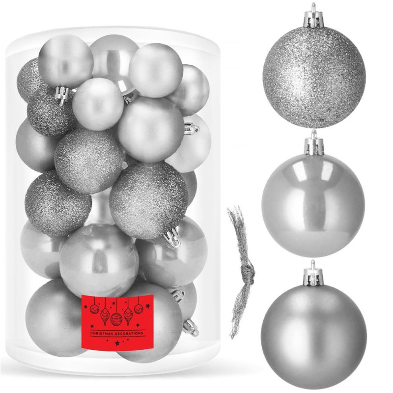 Sada 30 ks šedých a stříbrných baněk na stromeček se třemi různými vzory. Průměr baňky je 4, 5, 6 cm. Poutko na zavěšení, nerozbitný plastový materiál. Ideální k výzdobě stromečku nebo jako vánoční dekorace. Zdarma provázky pro snadné zavěšení.