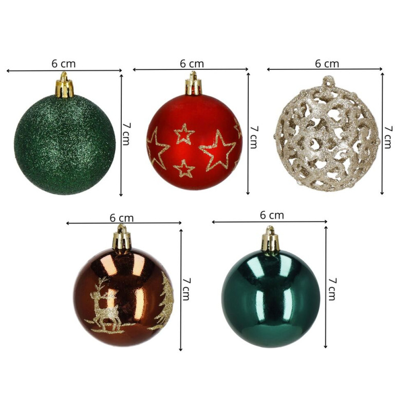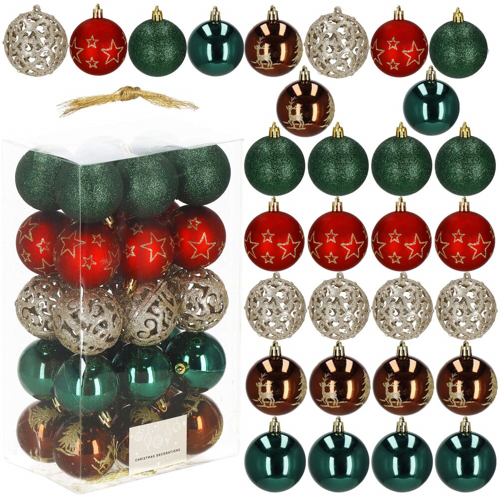 Vánoční baňky zelené mix – 6 cm, sada 30 ks CA1133, vnesou do vašeho domova tradiční vánoční atmosféru. Kombinace různých barev se zlatým zdobením působí elegantně a slavnostně, díky čemuž se tyto ozdoby skvěle hodí na vánoční stromeček, do věnců i dalších dekorací. Různé povrchové úpravy – lesklé, matné i třpytivé – vytvářejí krásný kontrast a dodávají výzdobě hloubku a lesk.