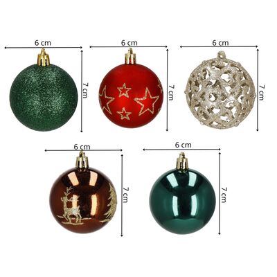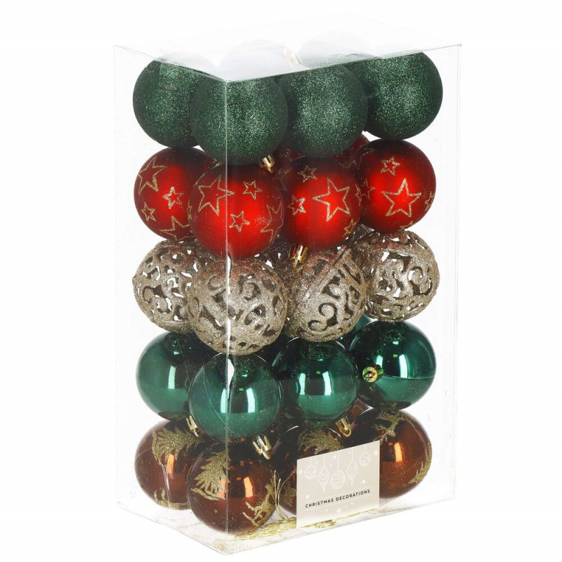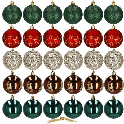 Stylová sada vánočních ozdob v barevném mixu se zlatým zdobením dodá vašemu stromečku tradiční a elegantní vzhled. Koule o průměru 6 cm jsou ideální na stromeček i jako dekorace do interiéru. Vyrobeny z nerozbitného plastu, vhodné pro vnitřní i venkovní použití. Součástí balení jsou poutka na zavěšení. Celkem 30 kusů v sadě.
