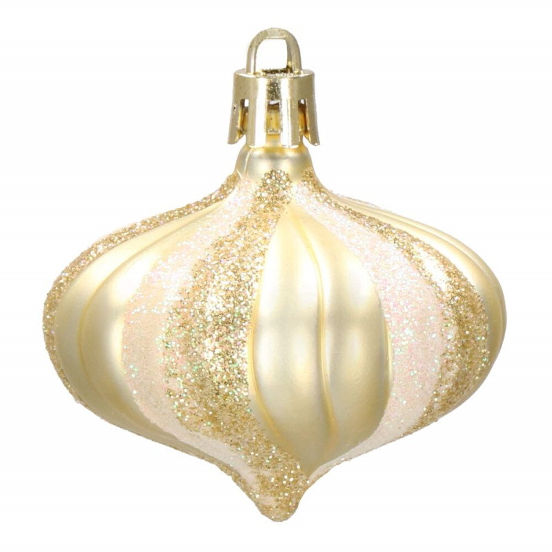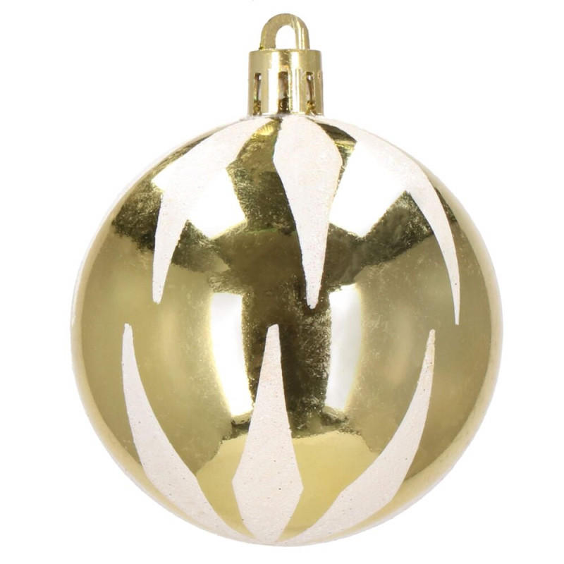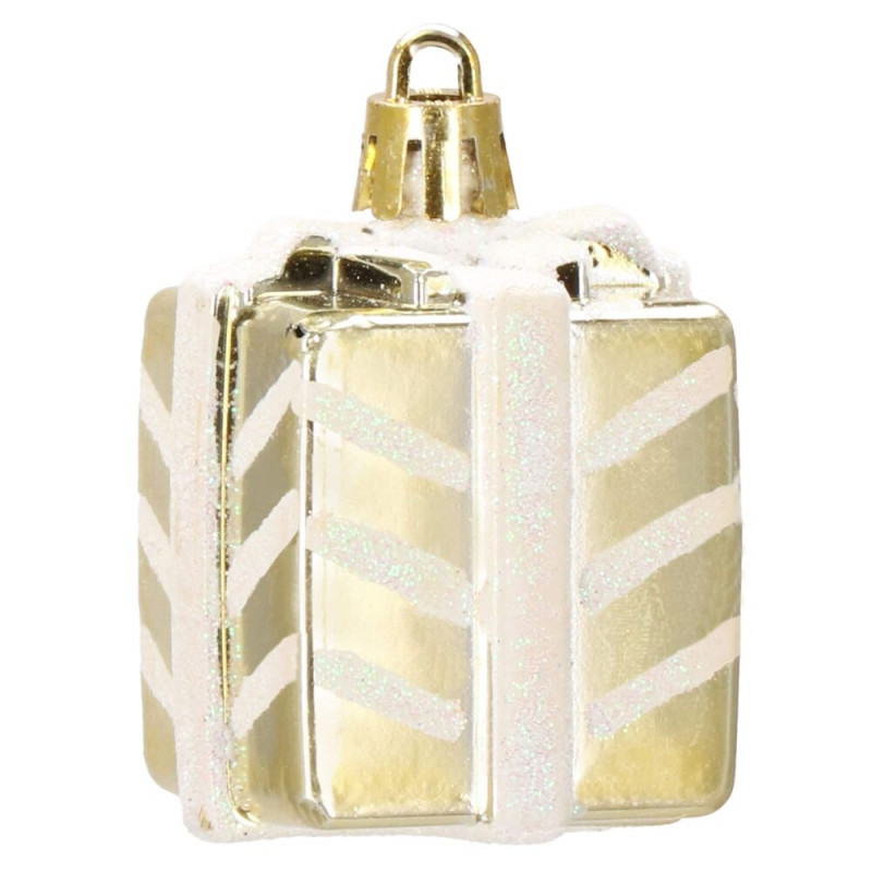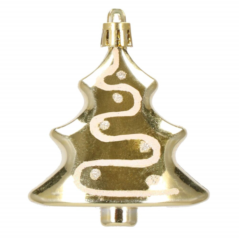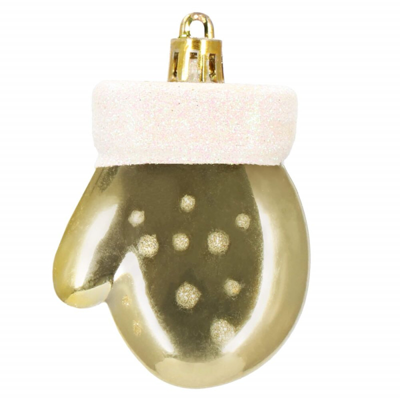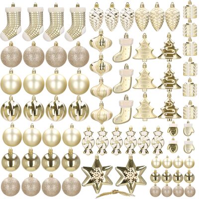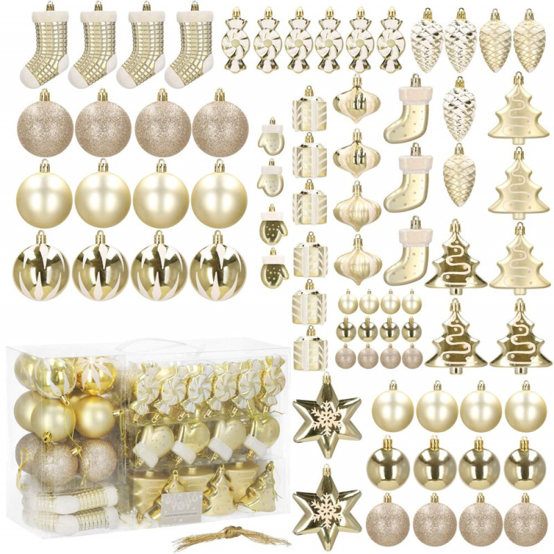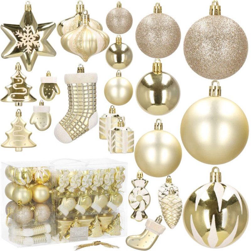 Luxusní sada vánočních ozdob ve zlatém provedení pro dokonalou sváteční výzdobu. Obsahuje 77 kusů v 21 různých vzorech – koule, hvězdy, stromečky, punčochy a další tvary. Vyrobeno z nerozbitného plastu, vhodné pro vnitřní i venkovní použití. Součástí balení jsou poutka na zavěšení. Ideální pro ozdobení vánočního stromečku i dalších dekorací.
