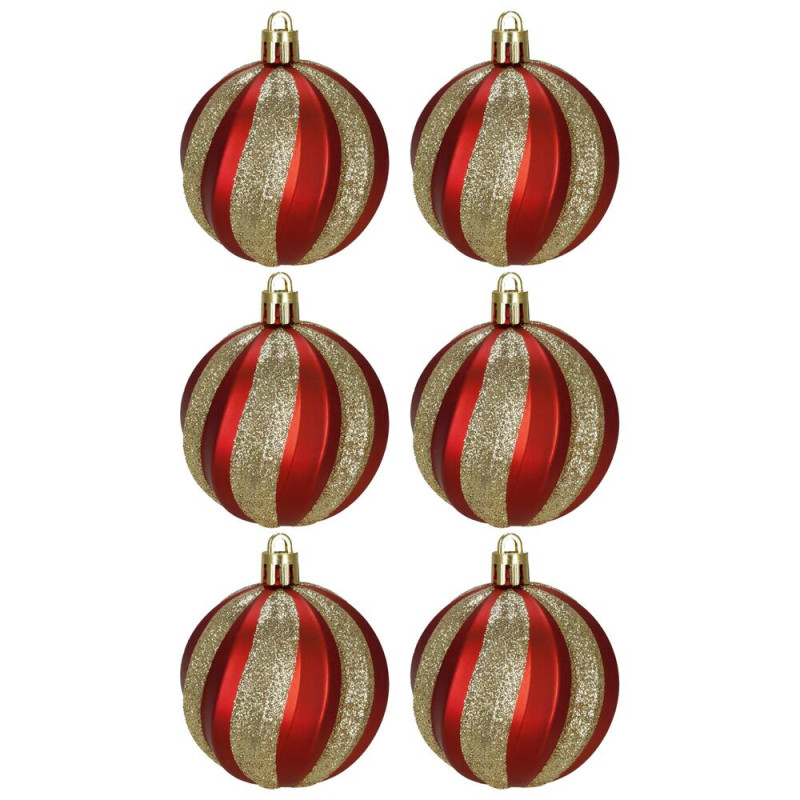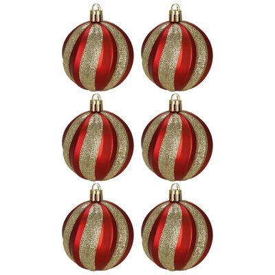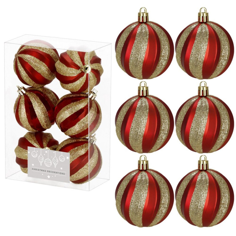 Elegantní sada vánočních ozdob v červeno-zlatém provedení se třpytivým zdobením dodá vašemu stromečku klasický a slavnostní vzhled. Koule o průměru 6 cm jsou ideální na vánoční stromeček i jako dekorace do interiéru. Vyrobeny z nerozbitného plastu, vhodné pro vnitřní i venkovní použití. Součástí balení jsou poutka na zavěšení. Celkem 6 kusů v sadě.