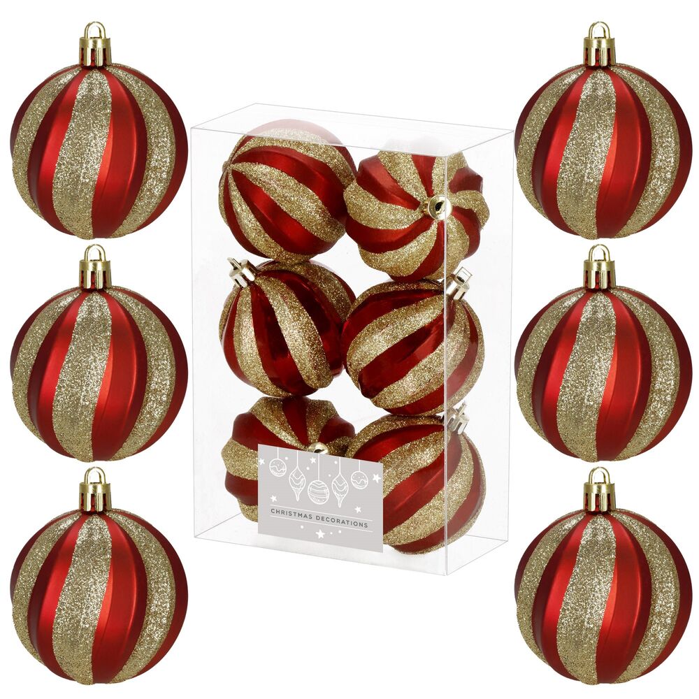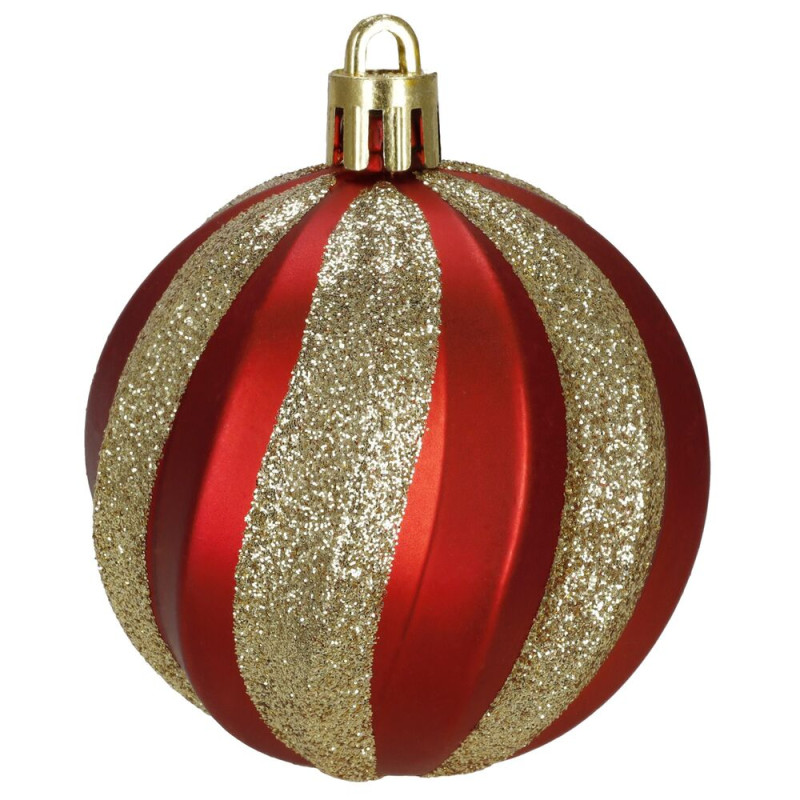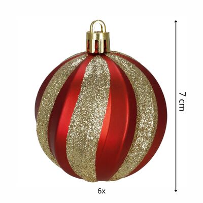 Elegantní sada vánočních ozdob v červeno-zlatém provedení se třpytivým zdobením dodá vašemu stromečku klasický a slavnostní vzhled. Koule o průměru 7 cm jsou ideální na vánoční stromeček i jako dekorace do interiéru. Vyrobeny z nerozbitného plastu, vhodné pro vnitřní i venkovní použití. Součástí balení jsou poutka na zavěšení. Celkem 6 kusů v sadě.