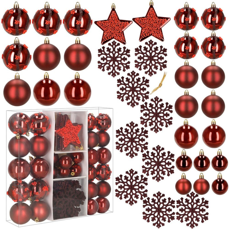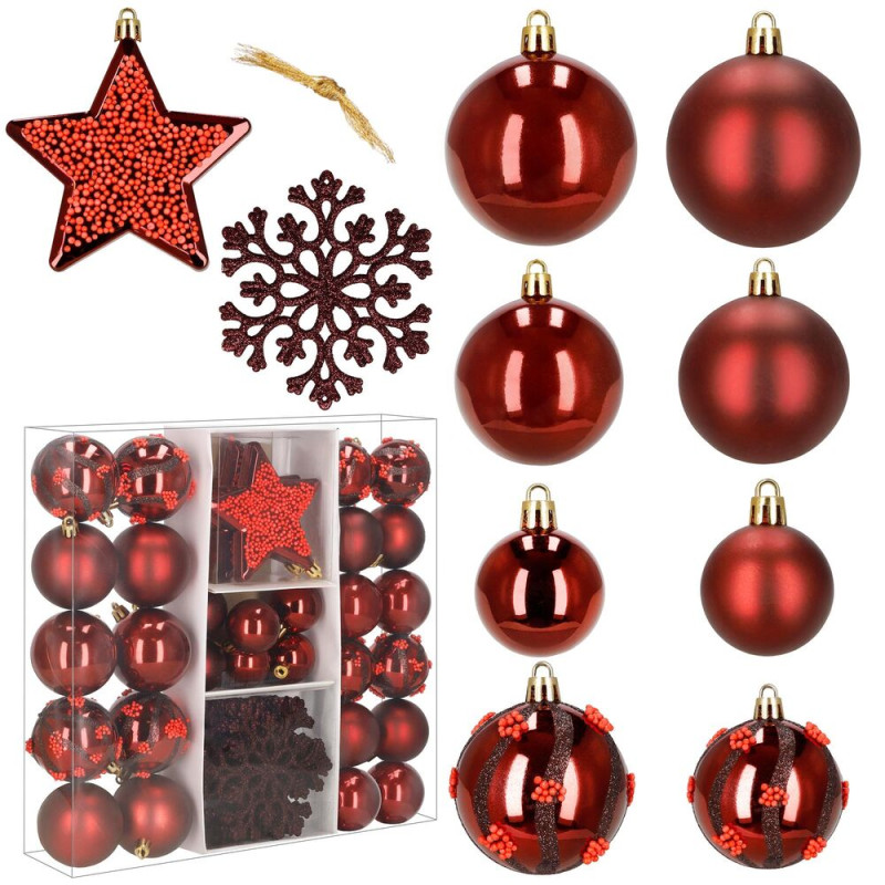 Vánoční baňky červené mix – 7/6/5 cm, sada 40 ks CA1523, přinesou do vašeho domova tradiční a slavnostní atmosféru. Kombinace červené barvy s lesklým a matným povrchem dodává výzdobě hloubku a teplo, které jsou pro Vánoce typické. Sada obsahuje nejen koule různých velikostí, ale i hvězdy a vločky, které ozdobí váš stromeček, věnec či jiné sváteční aranžmá.