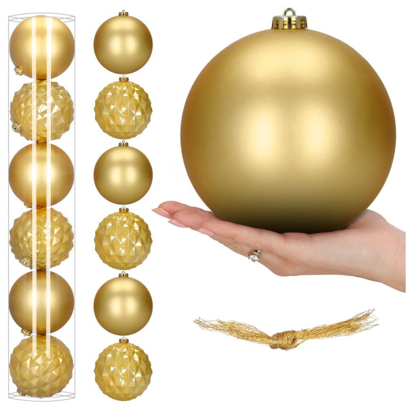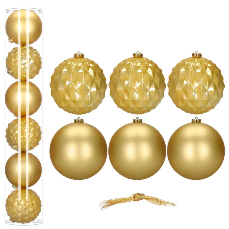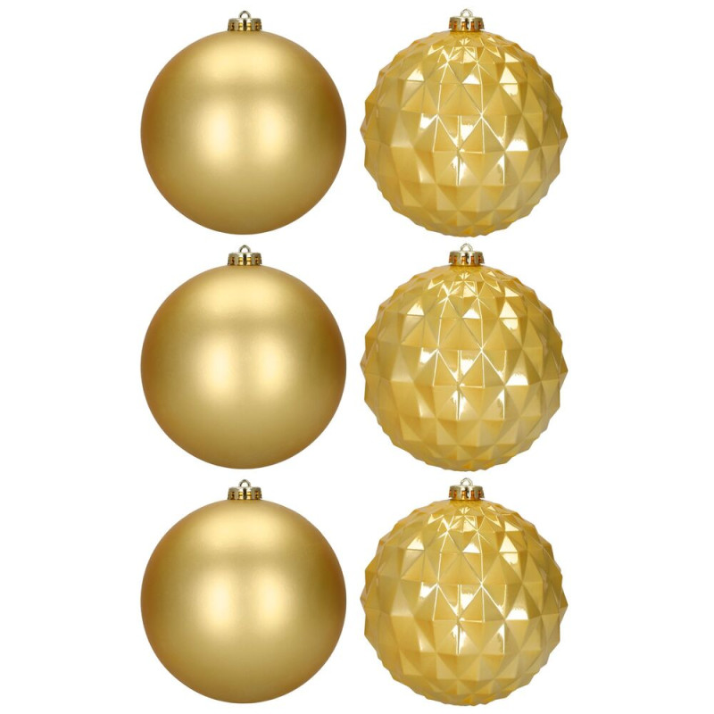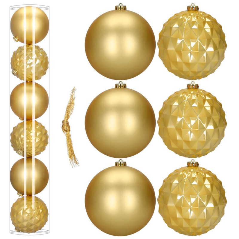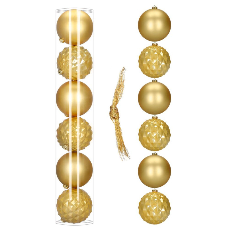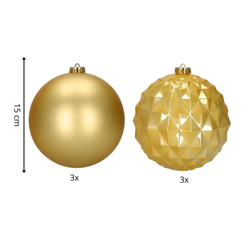 Vánoční baňky zlaté – 15 cm sada 6 ks dodají každé sváteční výzdobě luxusní a harmonický vzhled. Kombinace matného a lesklého povrchu vytváří efektní kontrast, který krásně doplní vánoční stromeček, věnec i různé dekorace. Baňky jsou vyrobeny z lehkého a pevného plastu, takže se snadno s nimi manipuluje a nehrozí jejich rozbití. Odolnost proti nárazům z nich dělá ideální volbu i do domácností s dětmi či mazlíčky.