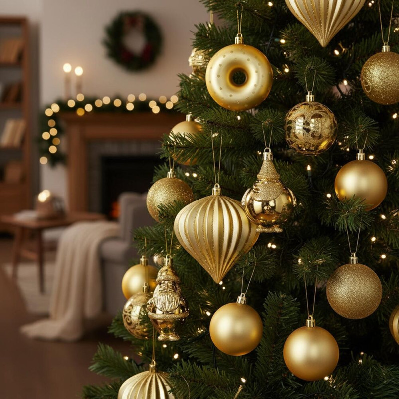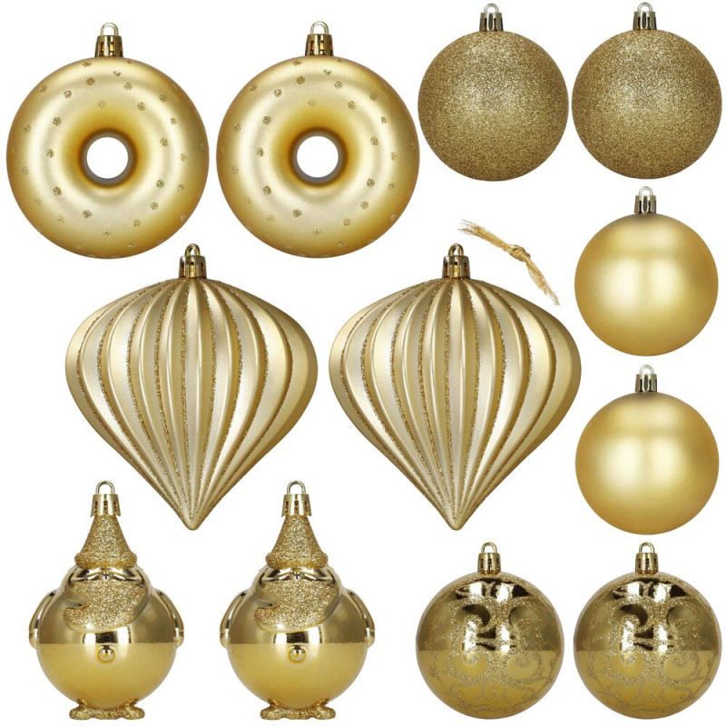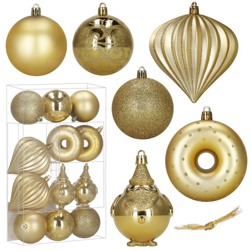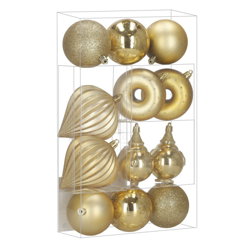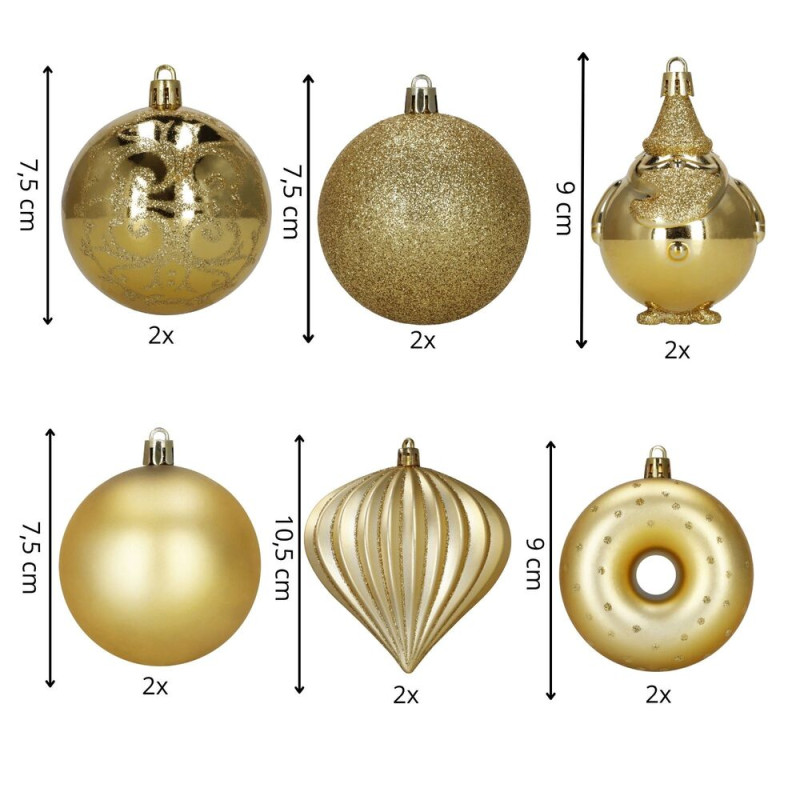 Elegantní sada vánočních ozdob v různých tvarech a odstínech zlaté barvy dodá sváteční výzdobě luxusní vzhled. Obsahuje lehké, nerozbitné dekorace z plastu s praktickými poutky pro snadné zavěšení. Skvěle se hodí na stromeček i jako doplněk interiérové či venkovní dekorace. Průměry ozdob: 6 cm, 7,5 cm a 9 cm.