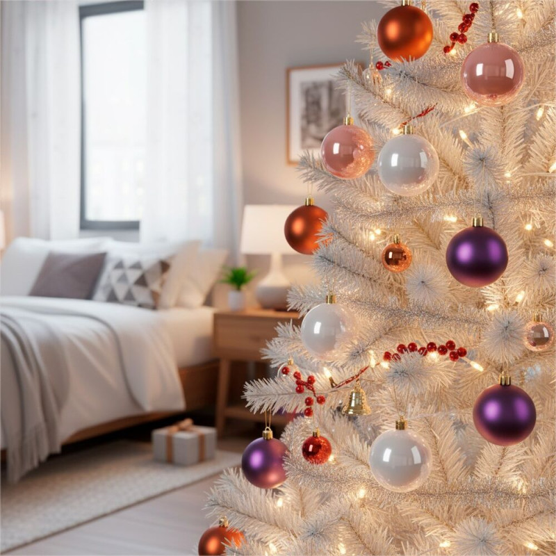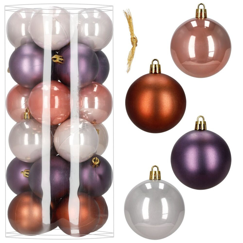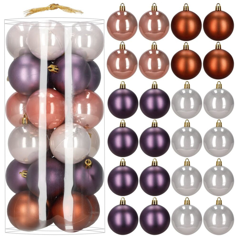 Vánoční baňky barevné mix – 6,5 cm sada 24 ks přinášejí svěží a moderní vzhled do vaší sváteční výzdoby. Kombinace elegantních odstínů vytváří harmonický celek, který skvěle doplní vánoční stromek i další dekorace v domácnosti. Baňky jsou vyrobeny z nerozbitného plastového materiálu, díky čemuž jsou lehké, bezpečné a vhodné i do domácností s dětmi či mazlíčky. Každá ozdoba je navíc opatřena praktickým poutkem pro zavěšení, které usnadňuje aranžování.