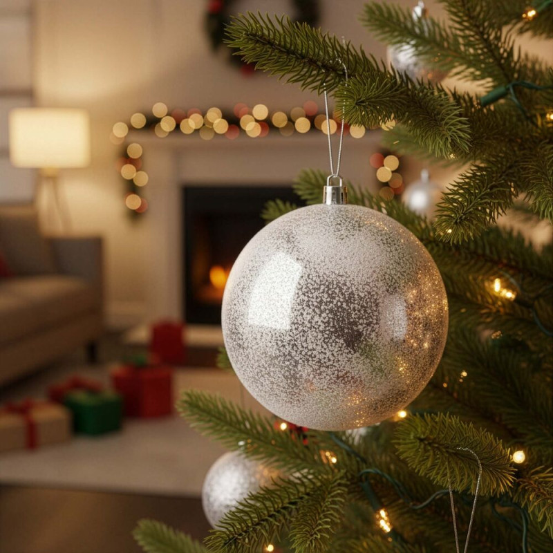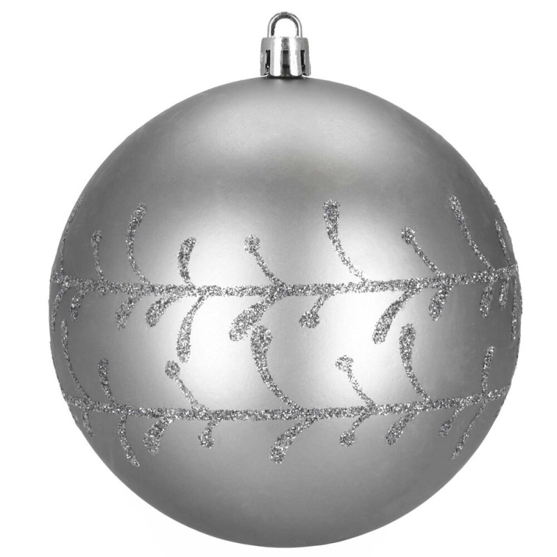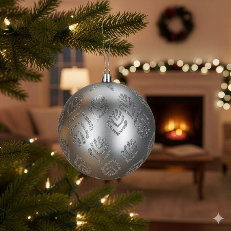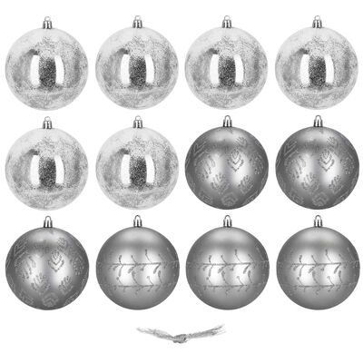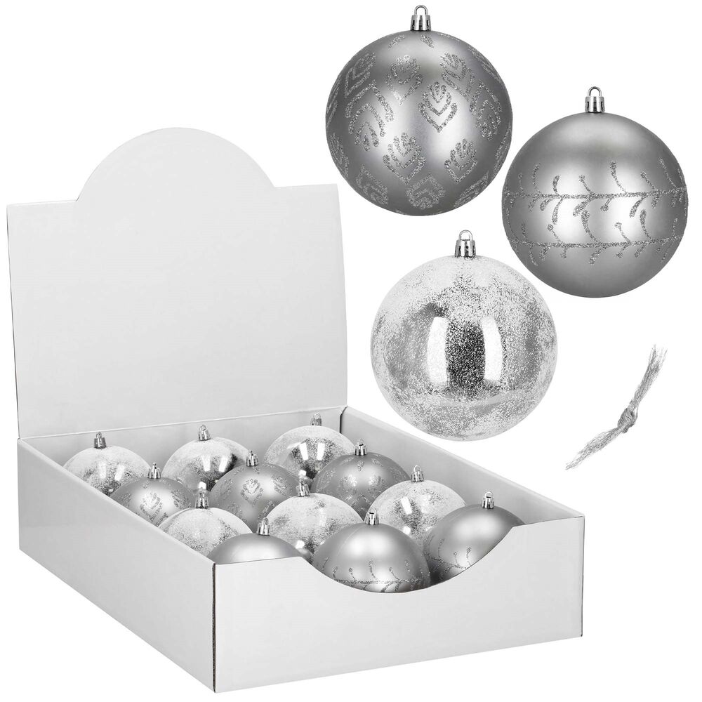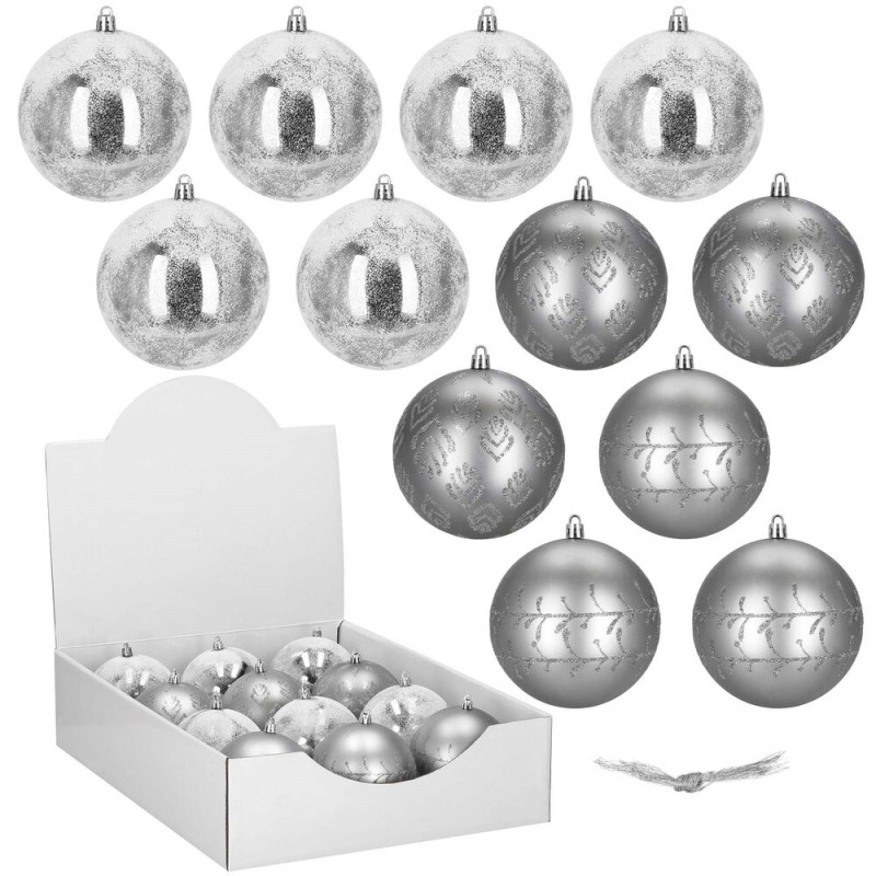 Sada 12 ks stříbrných baněk na stromeček se třemi různými vzory. Průměr baňky 9,5 cm, poutko na zavěšení, nerozbitný plastový materiál. Ideální k výzdobě stromečku nebo jako vánoční dekorace. Zdarma provázky pro snadné zavěšení.