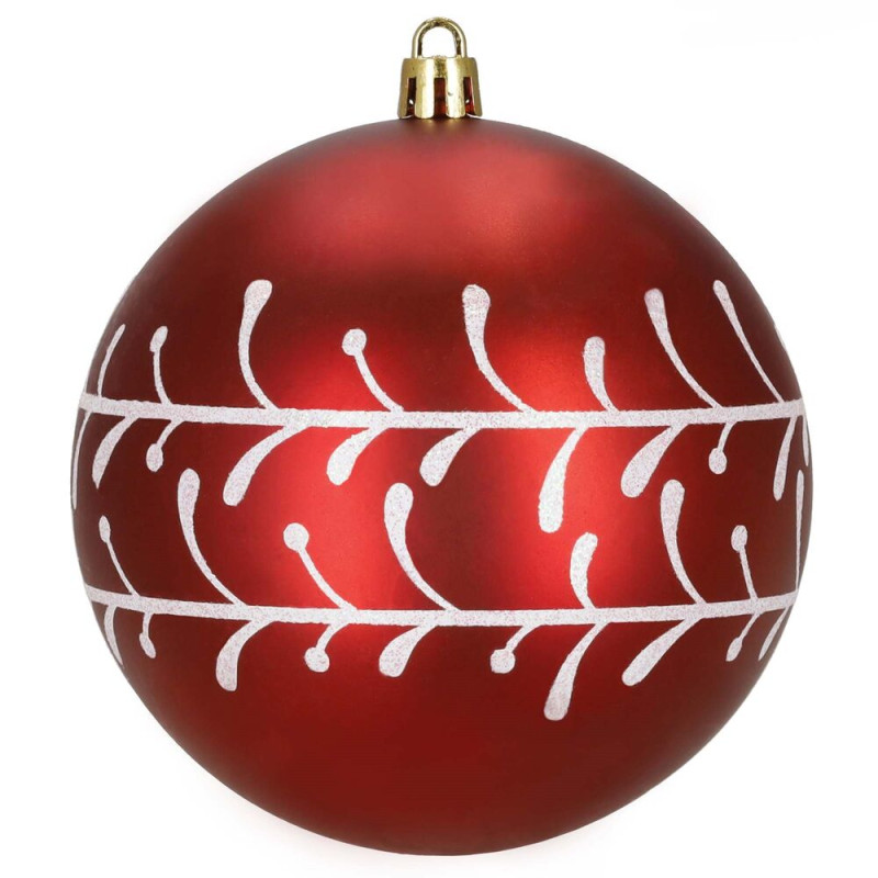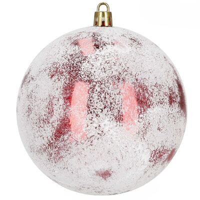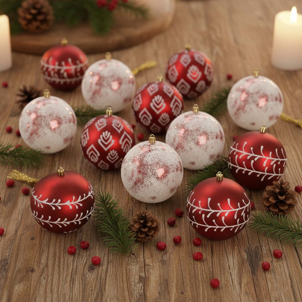 Sada červených vánočních koulí s bílým zdobením a zasněženým efektem dodá výzdobě výrazný sváteční nádech. Skvělé na stromeček i do dalších dekorací. Vyrobené z nerozbitného plastového materiálu, vhodné pro vnitřní i venkovní použití. Díky poutkům je zavěšení jednoduché a rychlé. Průměr 9,5 cm, celkem 12 kusů.