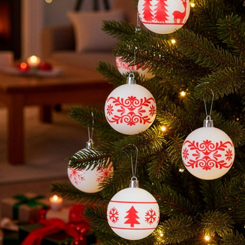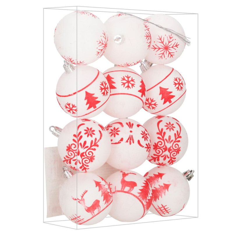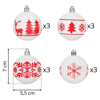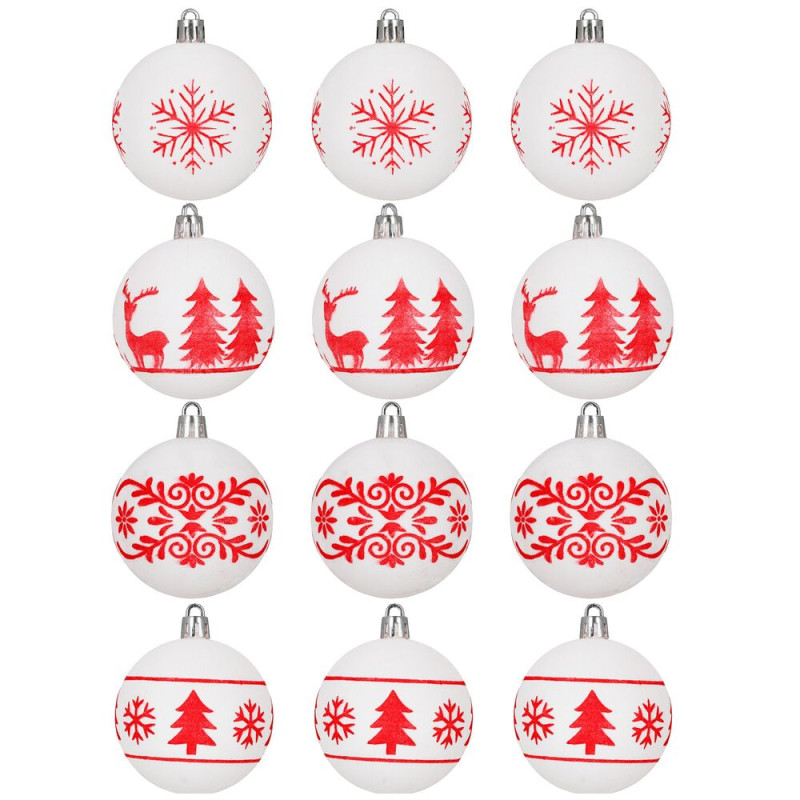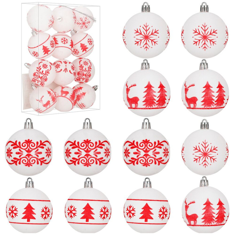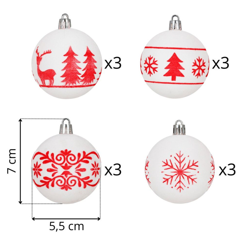 Sada bílých vánočních koulí s výraznými červenými motivy dodá výzdobě svěží a tradiční vzhled. Ideální na vánoční stromeček i jako dekorace do interiéru. Vyrobeny z nerozbitného plastového materiálu, vhodné pro vnitřní i venkovní použití. Součástí balení jsou poutka pro snadné zavěšení. Průměr 5,5 cm, celkem 12 kusů v sadě.