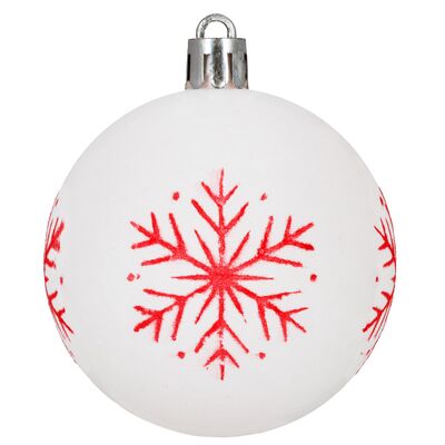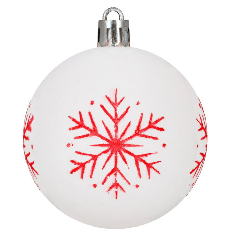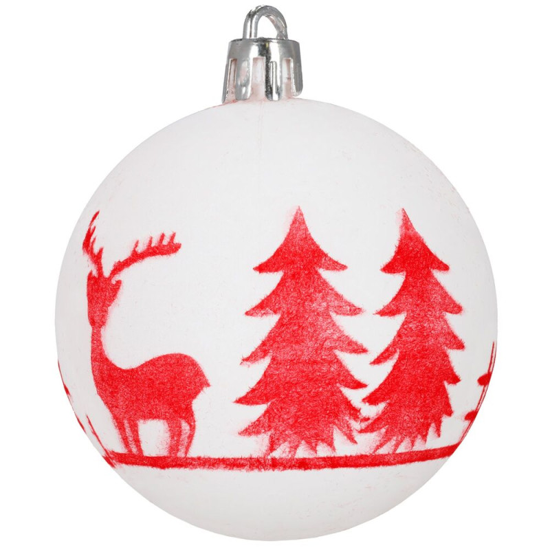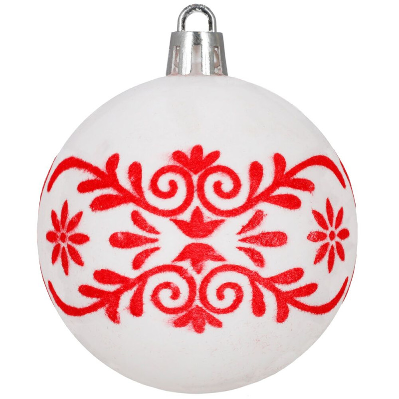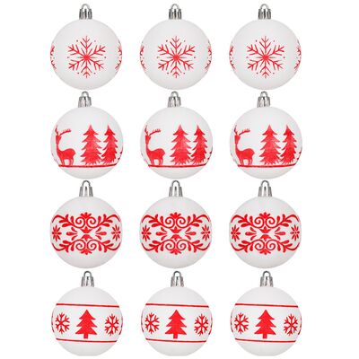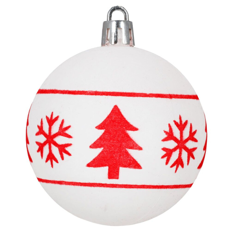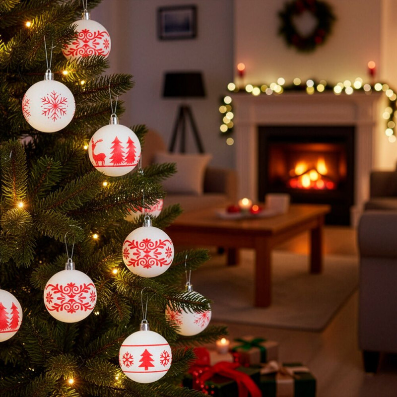 Sada bílých vánočních koulí s výraznými červenými motivy dodá výzdobě svěží a tradiční vzhled. Ideální na vánoční stromeček i jako dekorace do interiéru. Vyrobeny z nerozbitného plastového materiálu, vhodné pro vnitřní i venkovní použití. Součástí balení jsou poutka pro snadné zavěšení. Průměr 5,5 cm, celkem 12 kusů v sadě.