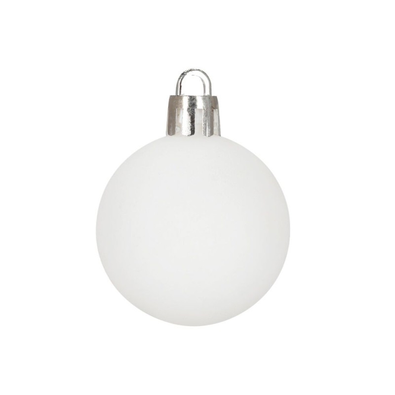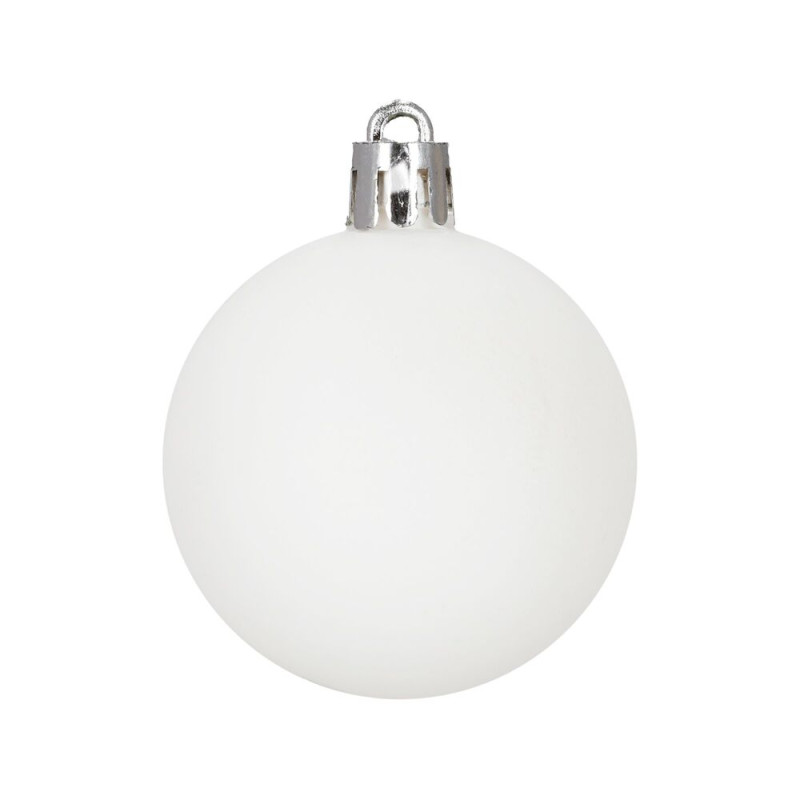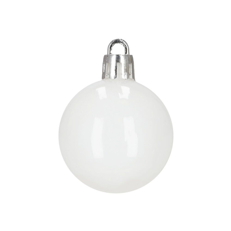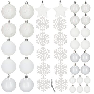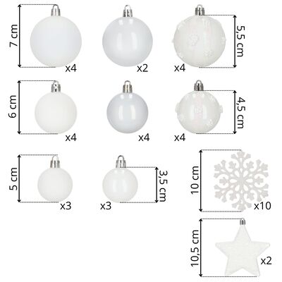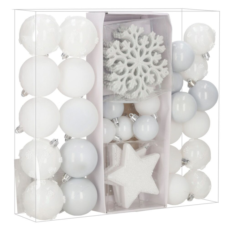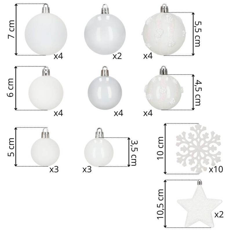 Sada bílých vánočních ozdob v různých tvarech a povrchových úpravách dodá výzdobě elegantní a zimní vzhled. Obsahuje lehké, nerozbitné plastové koule, vločky i hvězdy s poutky pro snadné zavěšení. Vhodné na stromeček i jako dekorace do interiéru či exteriéru. Průměry koulí: 3,5 cm, 4,5 cm a 5,5 cm.