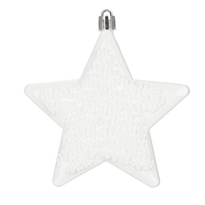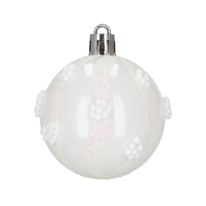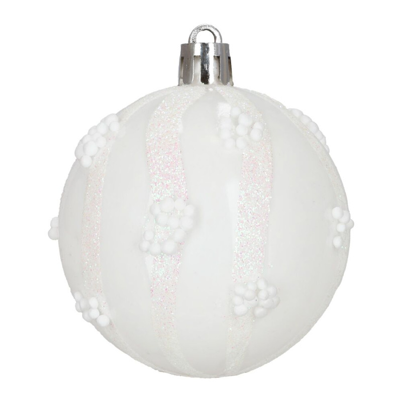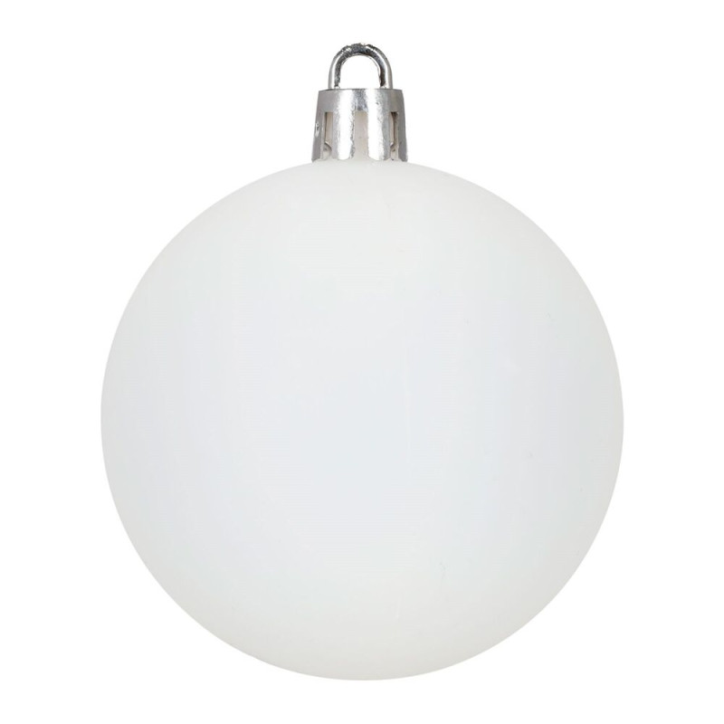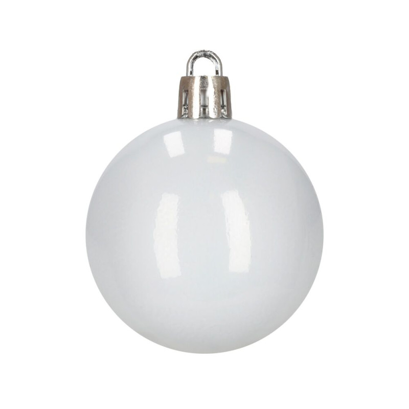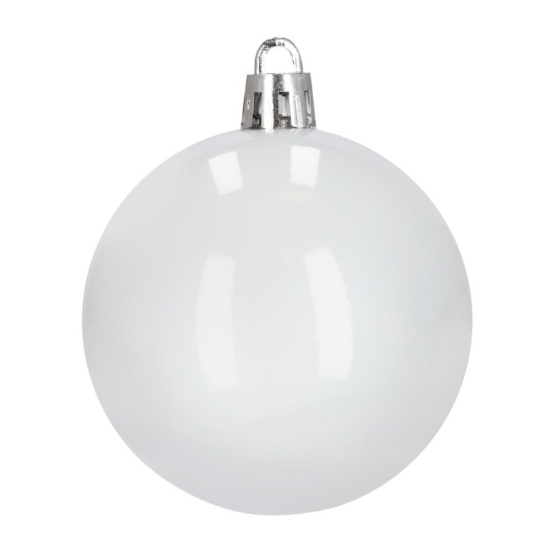 Sada bílých vánočních ozdob v různých tvarech a povrchových úpravách dodá výzdobě elegantní a zimní vzhled. Obsahuje lehké, nerozbitné plastové koule, vločky i hvězdy s poutky pro snadné zavěšení. Vhodné na stromeček i jako dekorace do interiéru či exteriéru. Průměry koulí: 3,5 cm, 4,5 cm a 5,5 cm.