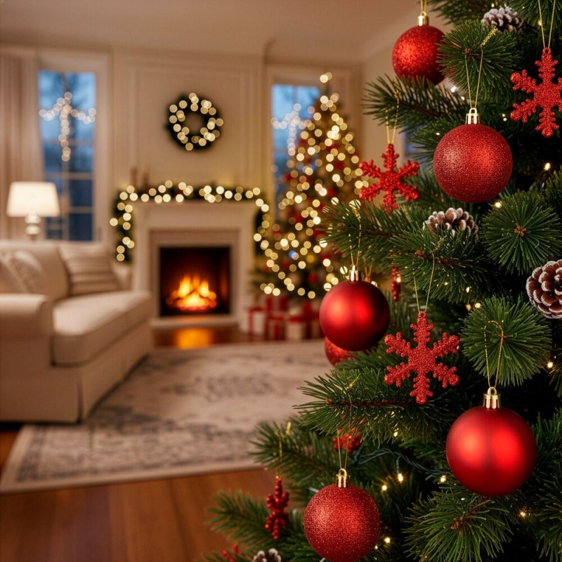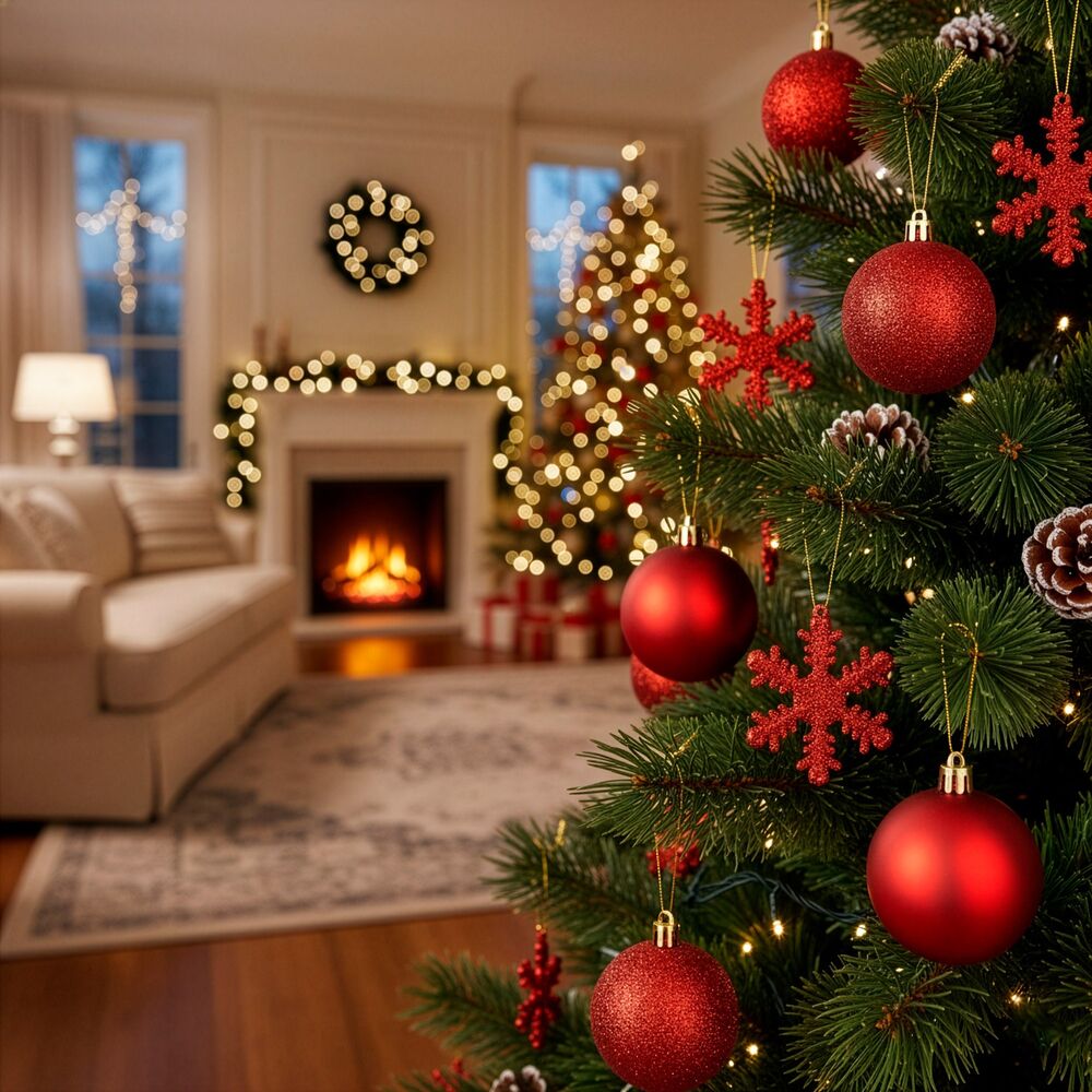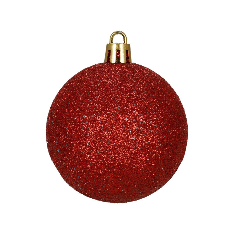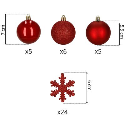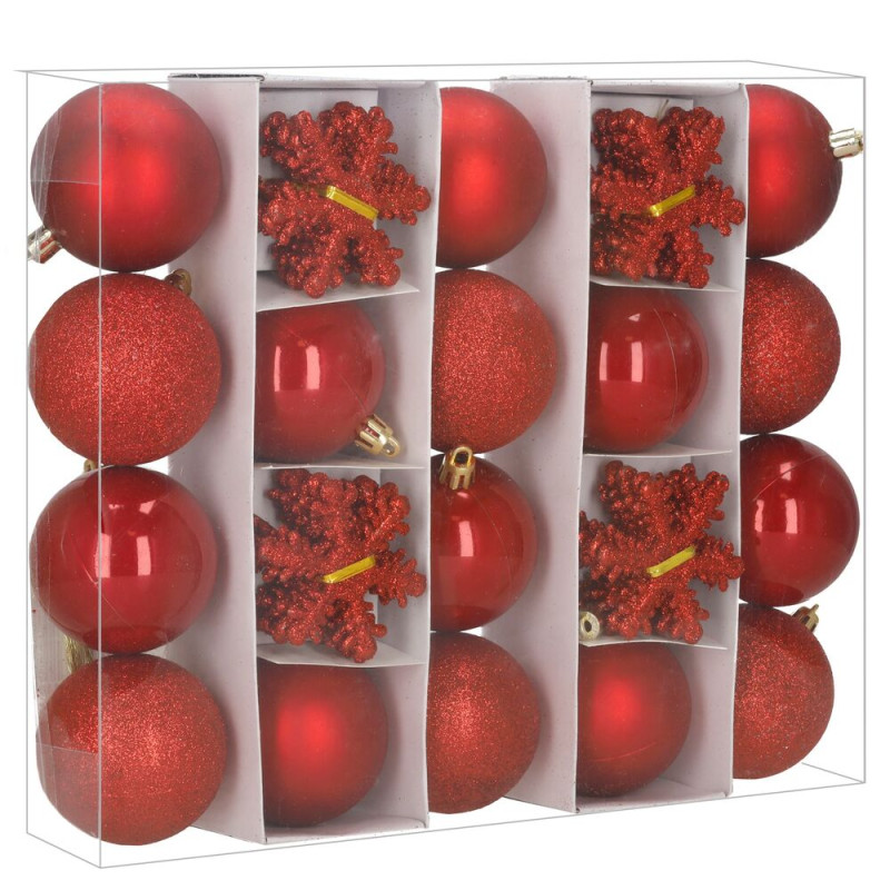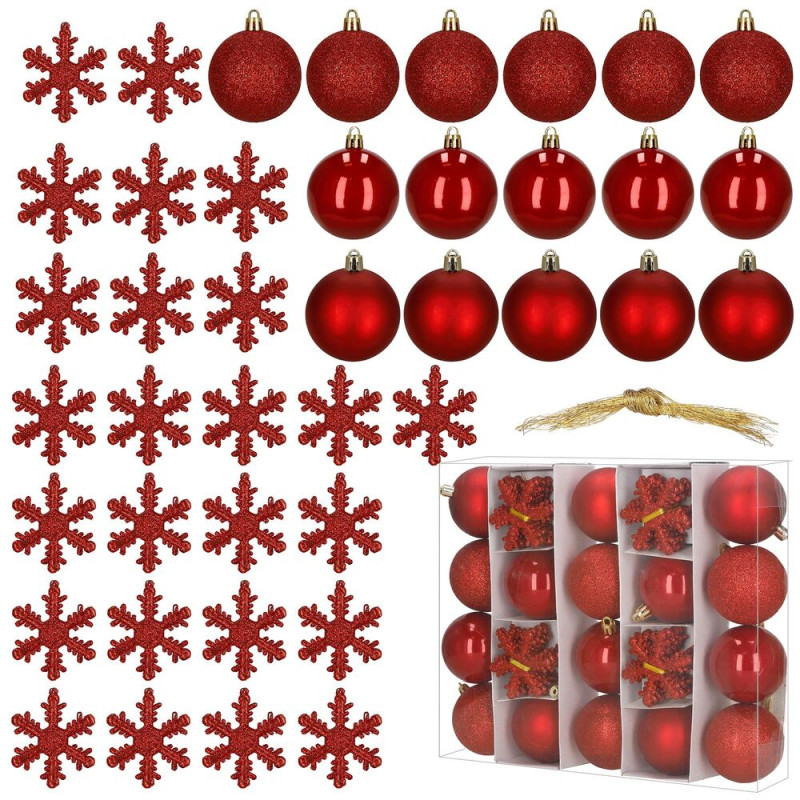 Sada červených vánočních ozdob v lesklém, matném i třpytivém provedení dodá výzdobě tradiční sváteční atmosféru. Obsahuje lehké, nerozbitné plastové koule i dekorativní ozdoby ve tvaru vločky, vše doplněné poutky pro snadné zavěšení. Skvěle se hodí na stromeček i jako interiérová či venkovní dekorace. Průměr koulí je 5,5 cm.