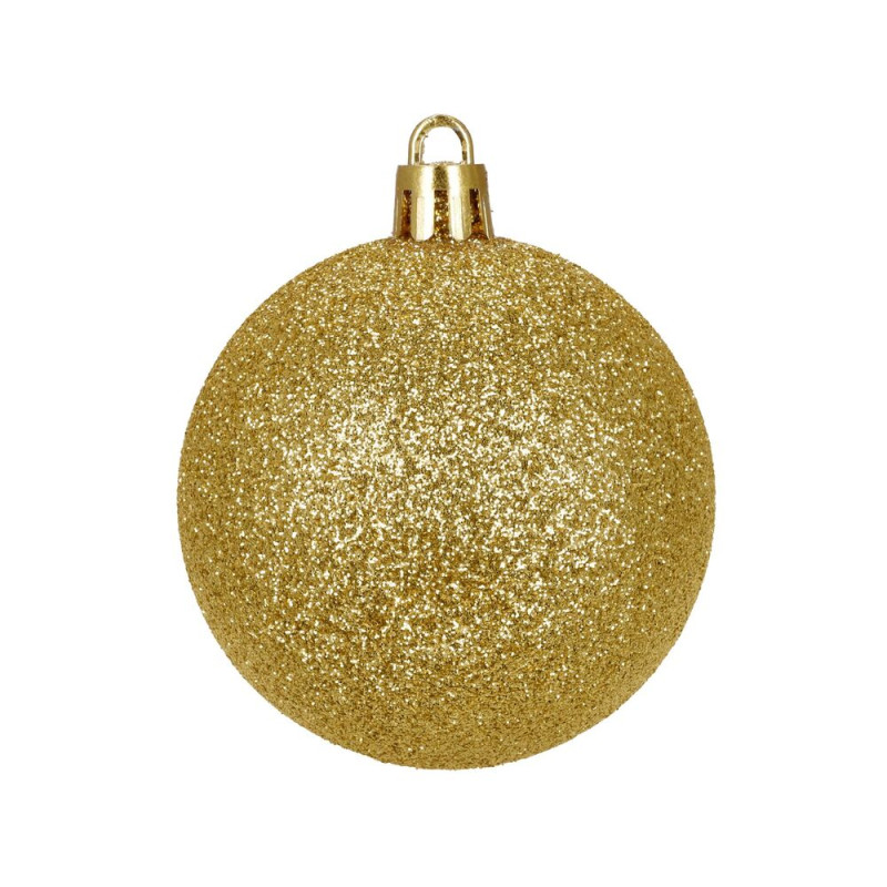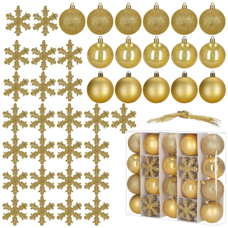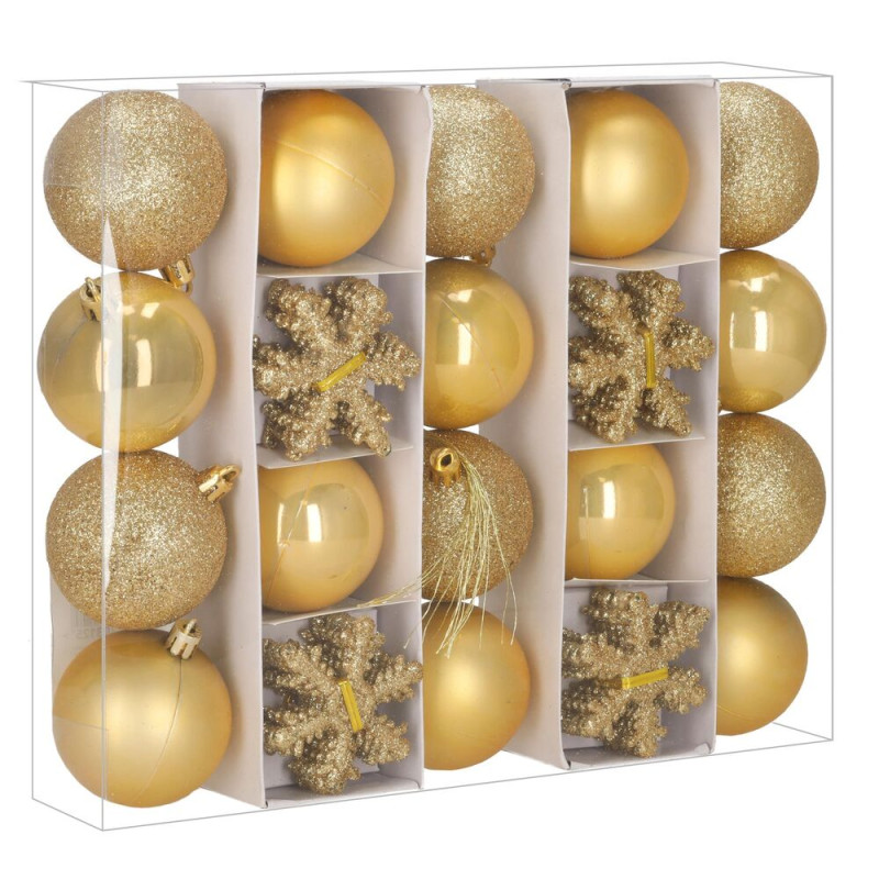 Luxusní sada zlatých vánočních ozdob v lesklém, matném i třpytivém provedení dodá dekoraci slavnostní vzhled. Obsahuje lehké, nerozbitné plastové koule i dekorativní vločky, vše s poutky pro snadné zavěšení. Skvělé na stromeček i pro výzdobu interiéru či exteriéru. Průměr koulí je 5,5 cm.