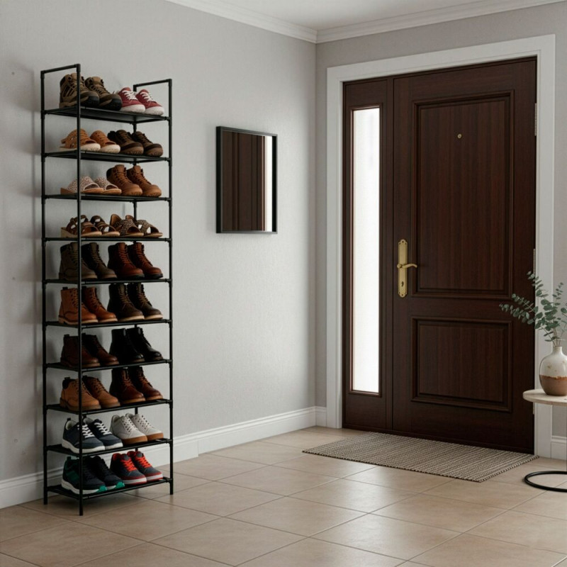 Vysoký kovový botník nabízí přehledné a úsporné řešení pro uložení většího množství obuvi. Deset polic poskytuje dostatek prostoru pro každodenní i sezónní boty, zatímco úzké provedení šetří místo v předsíni, šatně nebo chodbě. Pevná konstrukce zajišťuje stabilitu a vysokou nosnost, otevřený design podporuje cirkulaci vzduchu a snadný přístup k obuvi.