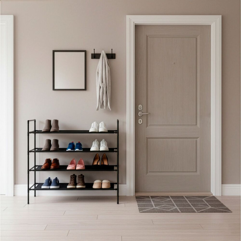 Praktický kovový botník nabízí přehledné uložení obuvi a pomáhá udržet pořádek v předsíni či chodbě. Čtyři police poskytují dostatek prostoru pro každodenní i sezónní boty, zatímco kompaktní rozměry šetří místo. Pevná konstrukce zajišťuje stabilitu a dobrou nosnost, otevřené provedení podporuje cirkulaci vzduchu a snadný přístup k obuvi.