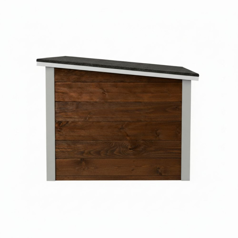 XL psí bouda určená pro celoroční venkovní použití. Dřevěná bouda se sendvičovým zateplením zajišťuje tepelný komfort v každém počasí. Lamelový vchod omezuje průnik chladu a větru. Šikmá voděodolná střecha chrání před deštěm i sněhem. Vyvýšená izolovaná podlaha zabraňuje vlhkosti od země a udržuje vnitřní prostor suchý a teplý. Celkové rozměry 106x72x67 cm, rozměry vstupu 36x41 cm.