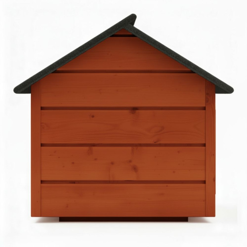 Psí bouda pro velká plemena psů určená pro celoroční venkovní použití. Dřevěná bouda se sendvičovým zateplením zajišťuje tepelný komfort v každém počasí. Lamelový vchod omezuje průnik chladu a větru. Sedlová voděodolná střecha chrání před deštěm i sněhem. Vyvýšená izolovaná podlaha udržuje vnitřní prostor suchý a teplý. Celkové rozměry 90x116x82 cm, rozměry vstupu 43x41 cm.