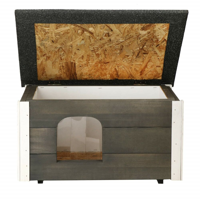Vchod s průhledným závěsem omezuje průvan a zadržuje teplo, zatímco zvedací střecha na pantech umožňuje snadné čištění i kontrolu vnitřního prostoru. Díky pevnému provedení, kvalitním materiálům a okamžité připravenosti k použití je bouda vhodná nejen pro psy, ale i pro další domácí zvířata.