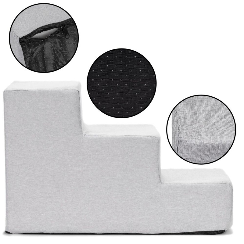 Praktické schůdky usnadňují psům bezpečné nastupování do auta, na postel nebo gauč a pomáhají šetřit klouby. Tři stabilní stupně zajišťují pohodlný přístup, zatímco protiskluzová základna brání posouvání. Potah z polyesteru je opatřen zipem, lze jej snadno sejmout a prát v pračce. Lehká, ale pevná konstrukce má nosnost až 25 kg.