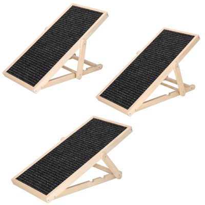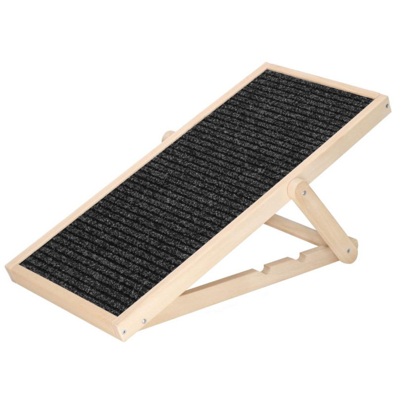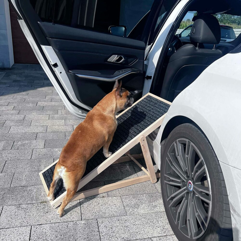 Psí rampa z kvalitního bukového dřeva usnadňuje psům bezpečný pohyb na vyvýšená místa a šetří jejich klouby. Díky regulovatelné výšce ve 3 stupních ji snadno přizpůsobíte aktuálním potřebám. Protiskluzová kobercová plocha je příjemná na došlap a zajišťuje jistotu při chůzi i u menších nebo starších psů. Nastavitelná výška 44-42,5-35 cm, délka 77 cm, šířka 35,5 cm, max. nosnost 60 kg.