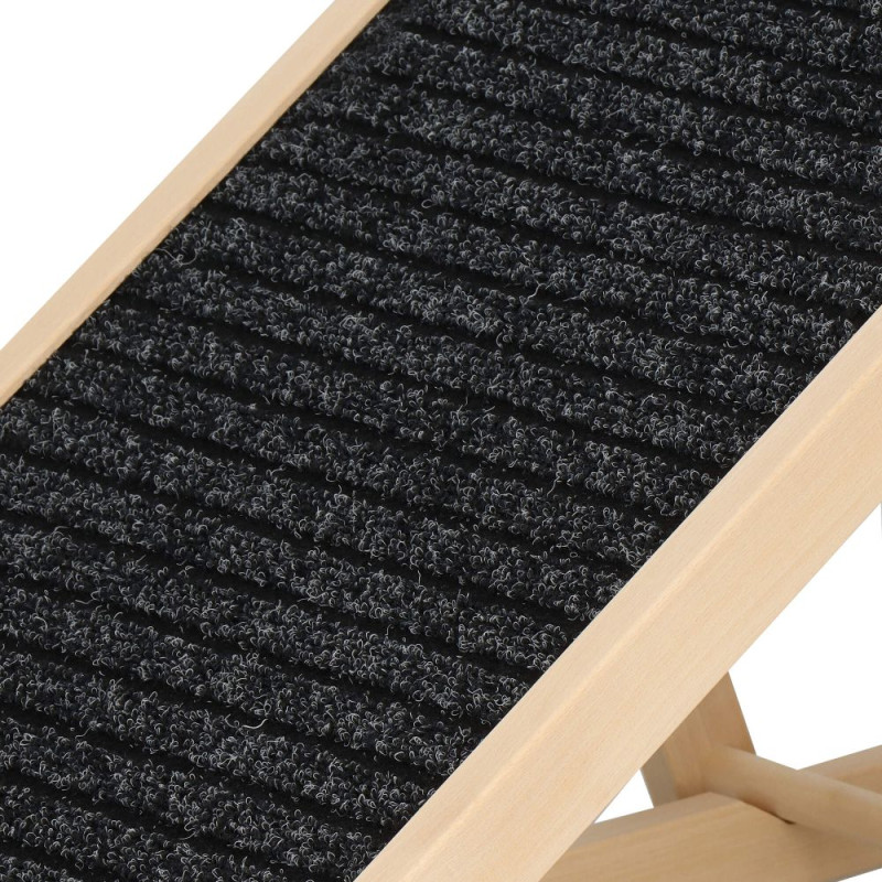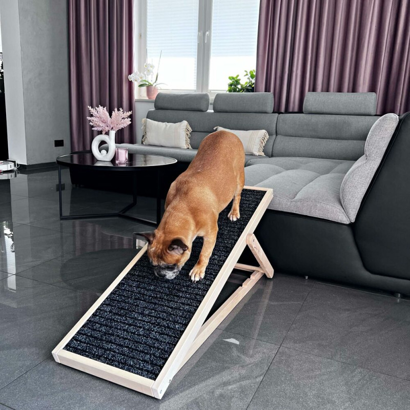 Velkou výhodou je regulovatelná výška ve 3 stupních, díky které lze rampu snadno přizpůsobit různým situacím. Protiskluzová a příjemná kobercová plocha poskytuje psovi jistotu při chůzi a pohodlný došlap bez obav z uklouznutí. Stabilní konstrukce zajišťuje bezpečné používání v interiéru i při častém každodenním využití.
