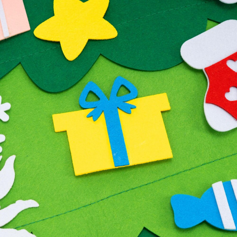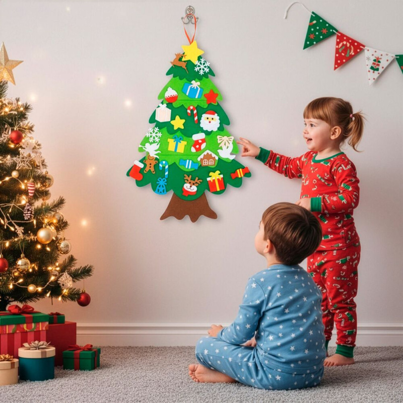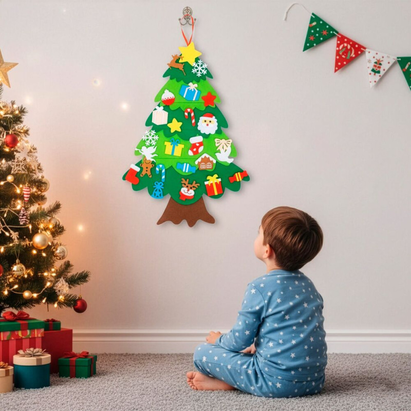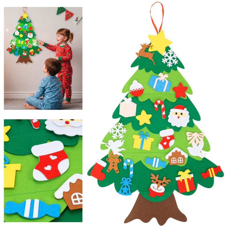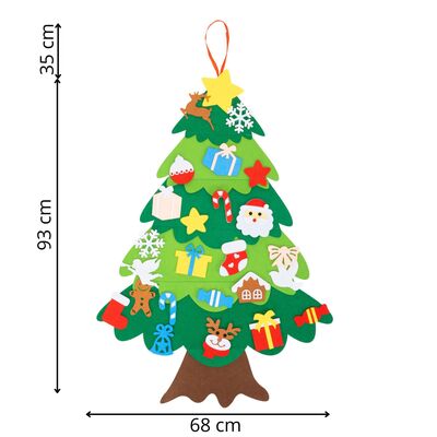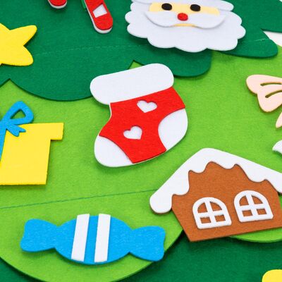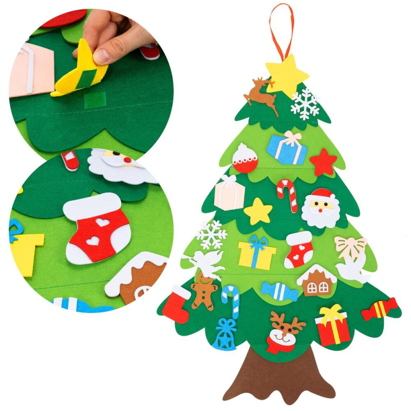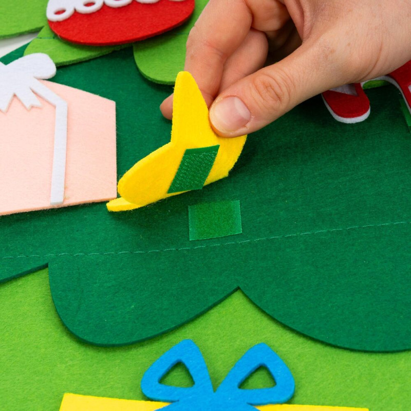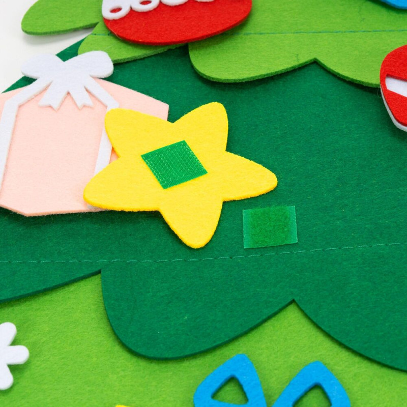 Veselá a bezpečná dětská dekorace, která umožní malým tvůrcům ozdobit si svůj vlastní vánoční stromeček. Plstěné ozdoby se snadno připevňují pomocí suchého zipu, takže je lze stále dokola přemisťovat. Měkký materiál je ideální pro malé děti a díky nízké hmotnosti lze stromeček jednoduše zavěsit na zeď nebo dveře.