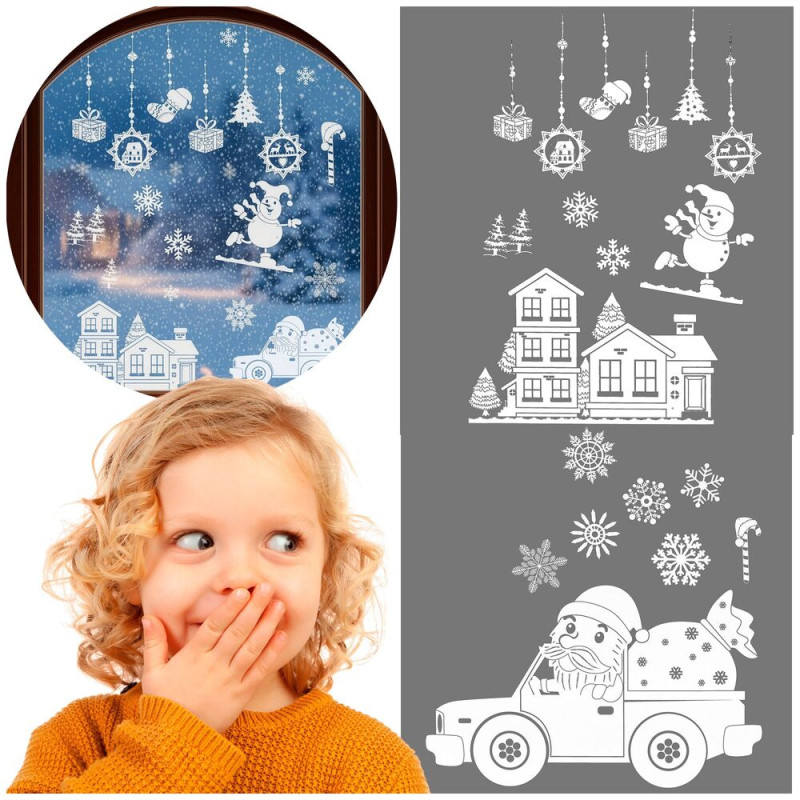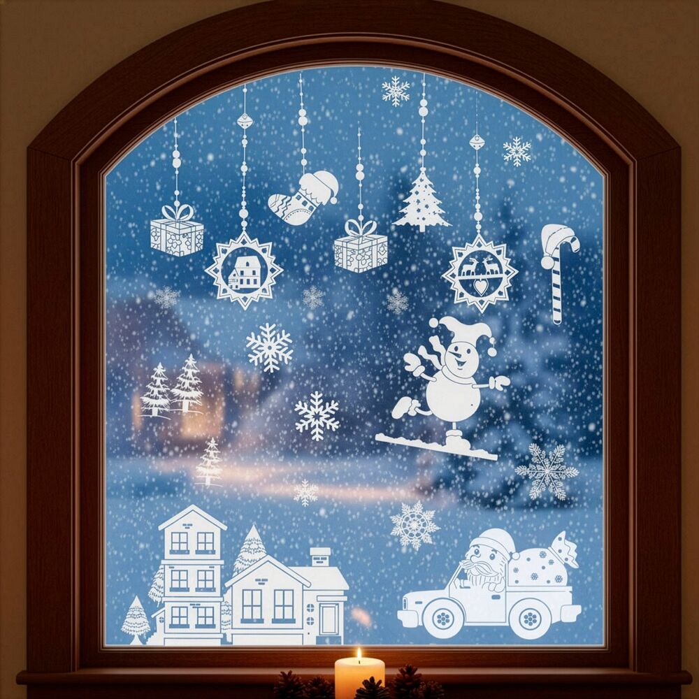 Vánoční samolepky na okno 50x35 cm sada 21 ks promění každé okno v pohádkovou zimní scénu. Díky bílé barvě krásně vyniknou na skle a přinesou do interiéru jemný, kouzelný nádech Vánoc. Motivy sněhuláka, městečka, Santy a zimních vloček vytvoří útulnou atmosféru a potěší děti i dospělé. Velkou výhodou je snadná aplikace, opakované použití a okamžité kouzlo vánoční výzdoby bez nutnosti složité instalace.