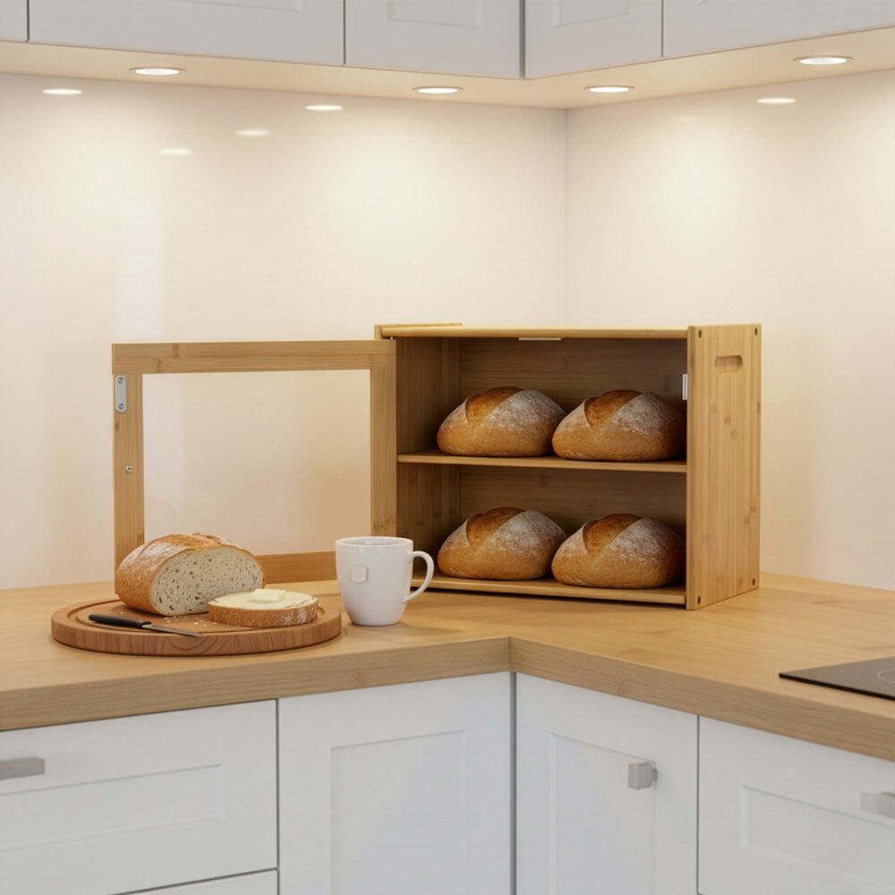 Stylový dřevěný chlebník z přírodního bambusu pomáhá uchovat pečivo déle čerstvé a zároveň zútulní kuchyň. Praktické provedení s průhledným okénkem umožňuje snadný přehled o obsahu bez otevírání. Magnetické zavírání zajišťuje pohodlné používání, vnitřní police nabízí dostatek prostoru pro různé druhy pečiva. Vhodný pro každodenní použití.