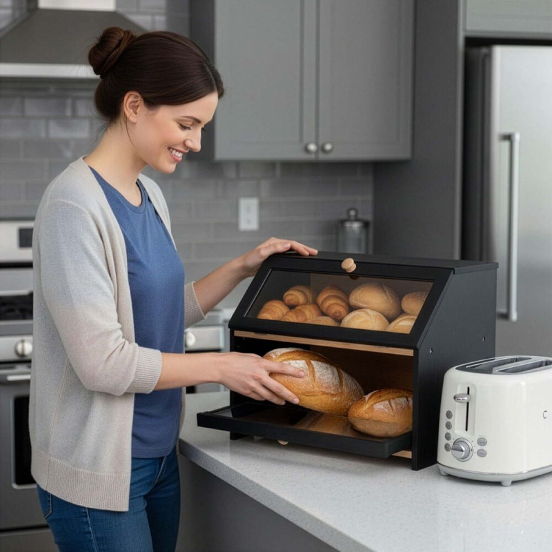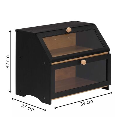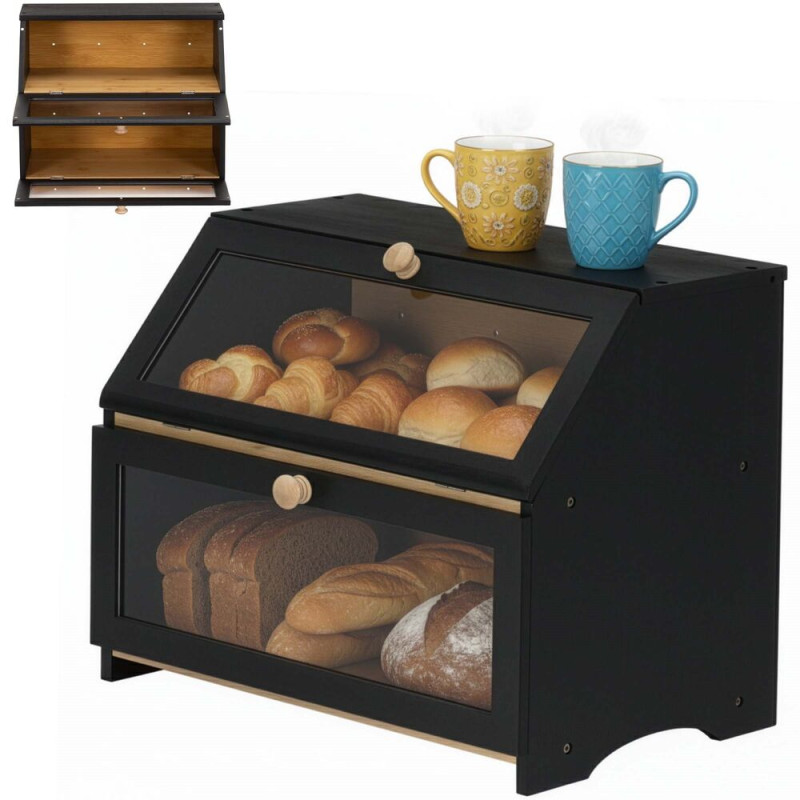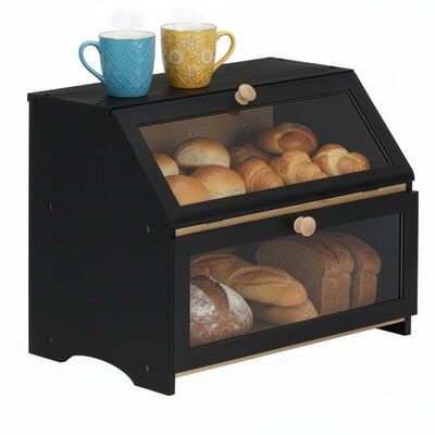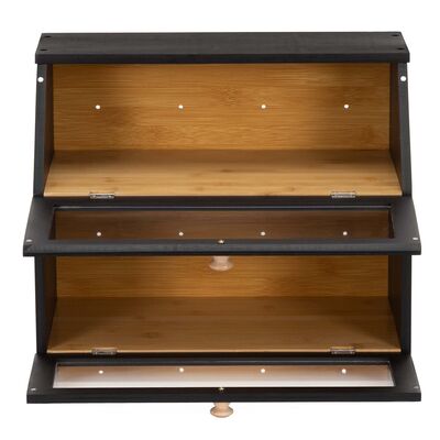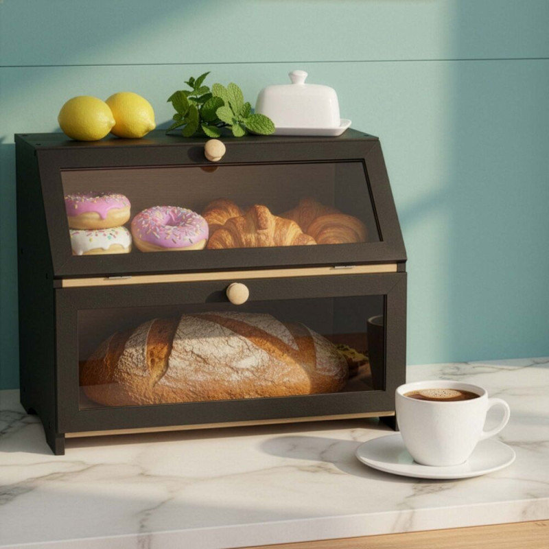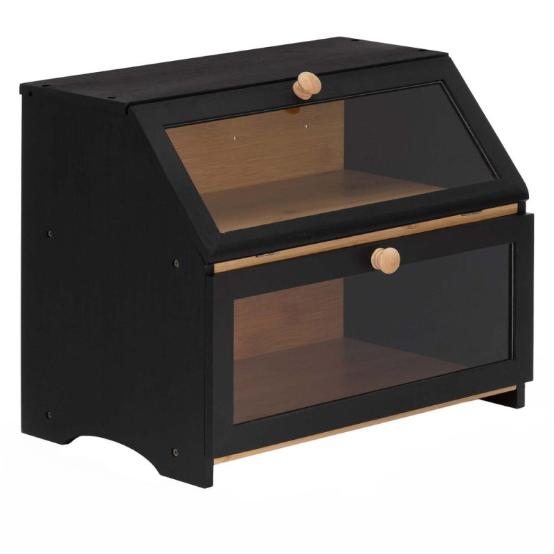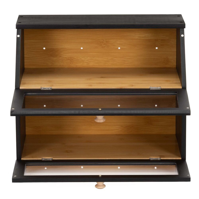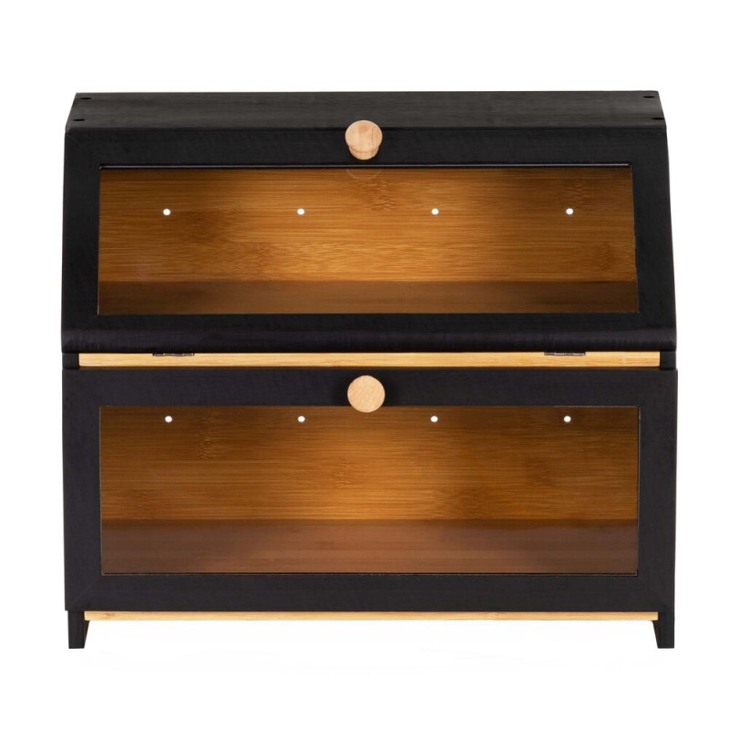 Stylový dvoupatrový chlebník v černém provedení nabízí praktické a přehledné uložení pečiva. Bambusová konstrukce pomáhá udržet chleba i pečivo déle čerstvé, zatímco průhledná akrylová okénka umožňují snadnou kontrolu obsahu bez otevírání. Magnetické zavírání zajišťuje pohodlné používání a boční úchyty usnadňují přenášení. Elegantní doplněk moderní kuchyně.