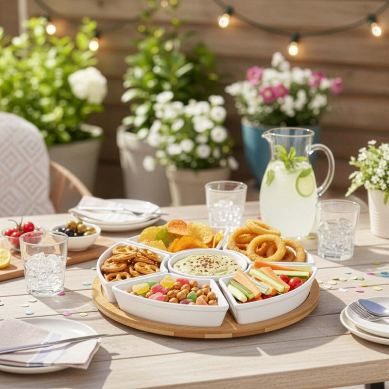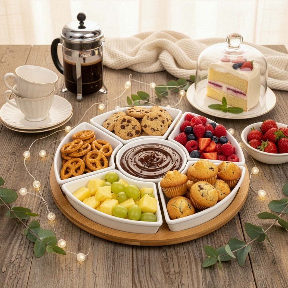 Součástí talíře je 5 porcelánových misek, které lze snadno oddělit a používat samostatně, což zvyšuje variabilitu servírování. Talíř je schválený pro styk s potravinami a nabízí dostatek prostoru pro oříšky, omáčky i drobné dezerty. Díky promyšlenému provedení umožňuje přehledné, pohodlné a efektní servírování, které zaujme na první pohled.