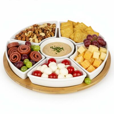 Servírovací talíř s otočnou funkcí o 360° je ideální pro stylové podávání pochutin nebo dezertů. Součástí je pět porcelánových misek, které lze snadno oddělit a používat samostatně. Kombinace bambusového podkladu a porcelánu působí elegantně a hodí se pro každou příležitost. Výrobek je schválený pro styk s potravinami a průměr 30 cm nabízí dostatek prostoru pro servírování.