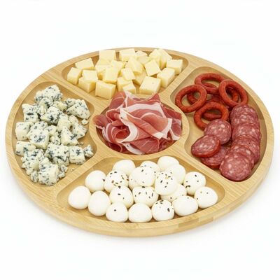 Talíř na servírování je vyroben z bambusového materiálu s přírodním vzhledem, který působí elegantně a nadčasově. Je schválený pro styk s potravinami, což zaručuje bezpečné používání při servírování sýrů, uzenin, ovoce i dezertů. Tento otočný talíř je praktickým i designovým prvkem, který zpříjemní každé stolování.