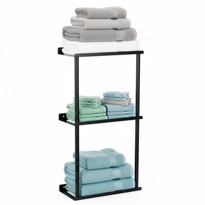 Praktický nástěnný držák v černém provedení nabízí přehledné a úsporné řešení pro uložení ručníků v koupelně. Více úrovní poskytuje dostatek prostoru pro složené textilie a pomáhá udržet pořádek i v menších místnostech. Pevná kovová konstrukce zajišťuje stabilitu při každodenním používání a jednoduchý design se snadno sladí s moderním i minimalistickým interiérem.