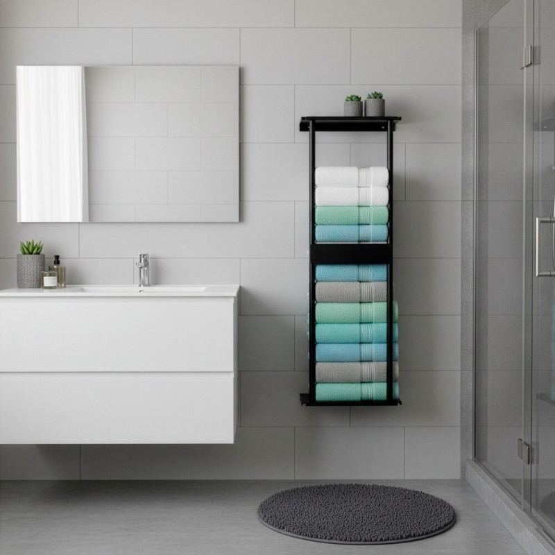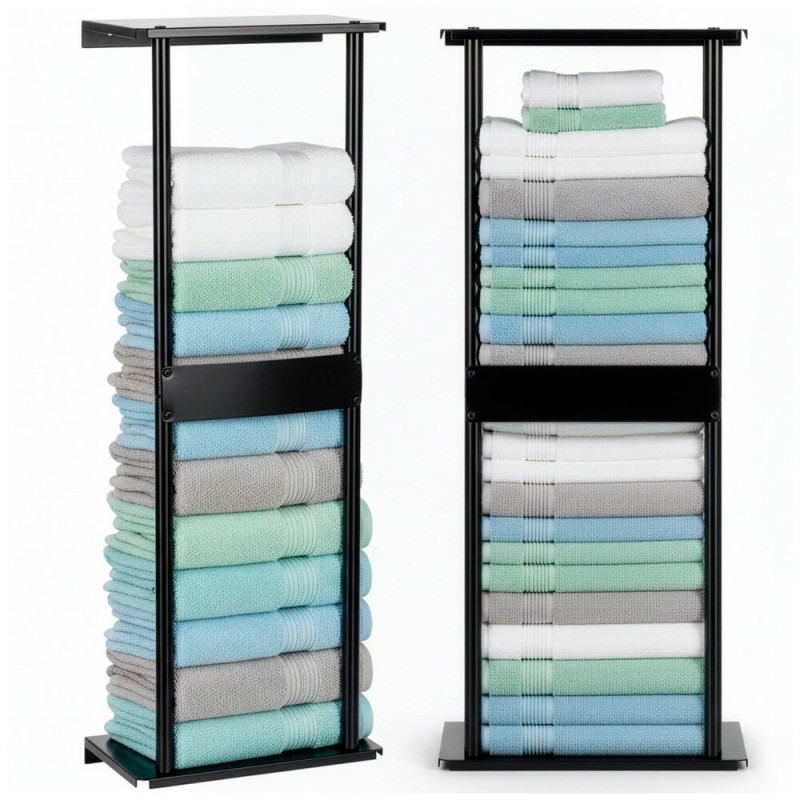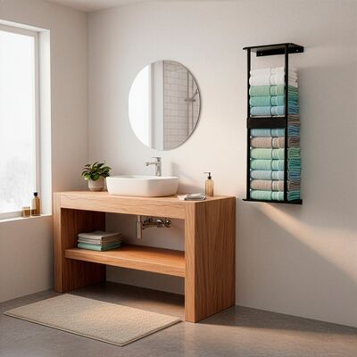 Praktický nástěnný držák v černém provedení nabízí úsporné a přehledné řešení pro ukládání ručníků v koupelně. Dvě police poskytují dostatek prostoru pro složené textilie a pomáhají udržet pořádek i v menších místnostech. Pevná kovová konstrukce zajišťuje stabilitu při každodenním používání a jednoduchý, moderní design se snadno sladí s různými styly interiéru. Montáž je snadná a zvládnutelná svépomocí.