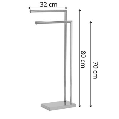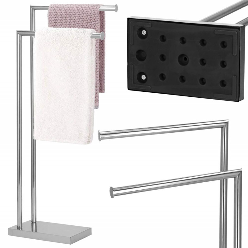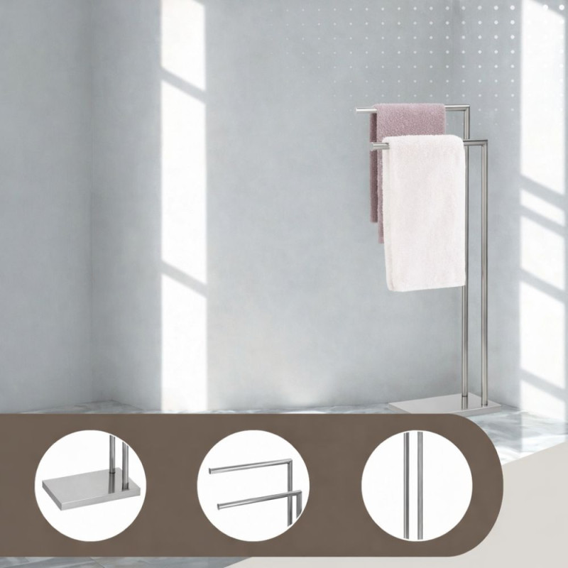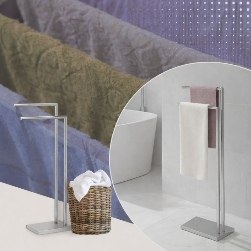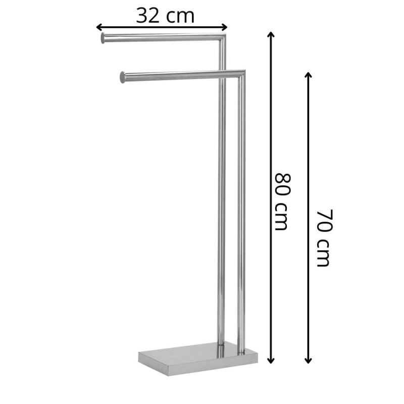 Držák je vybaven dvěma samostatnými rameny, která umožňují přehledné zavěšení a rychlé sušení ručníků. Díky kompaktním rozměrům a volně stojícímu provedení jej lze umístit kamkoliv bez nutnosti montáže. Odolný materiál a kvalitní zpracování zajišťují dlouhou životnost a spolehlivé používání v každodenním provozu.