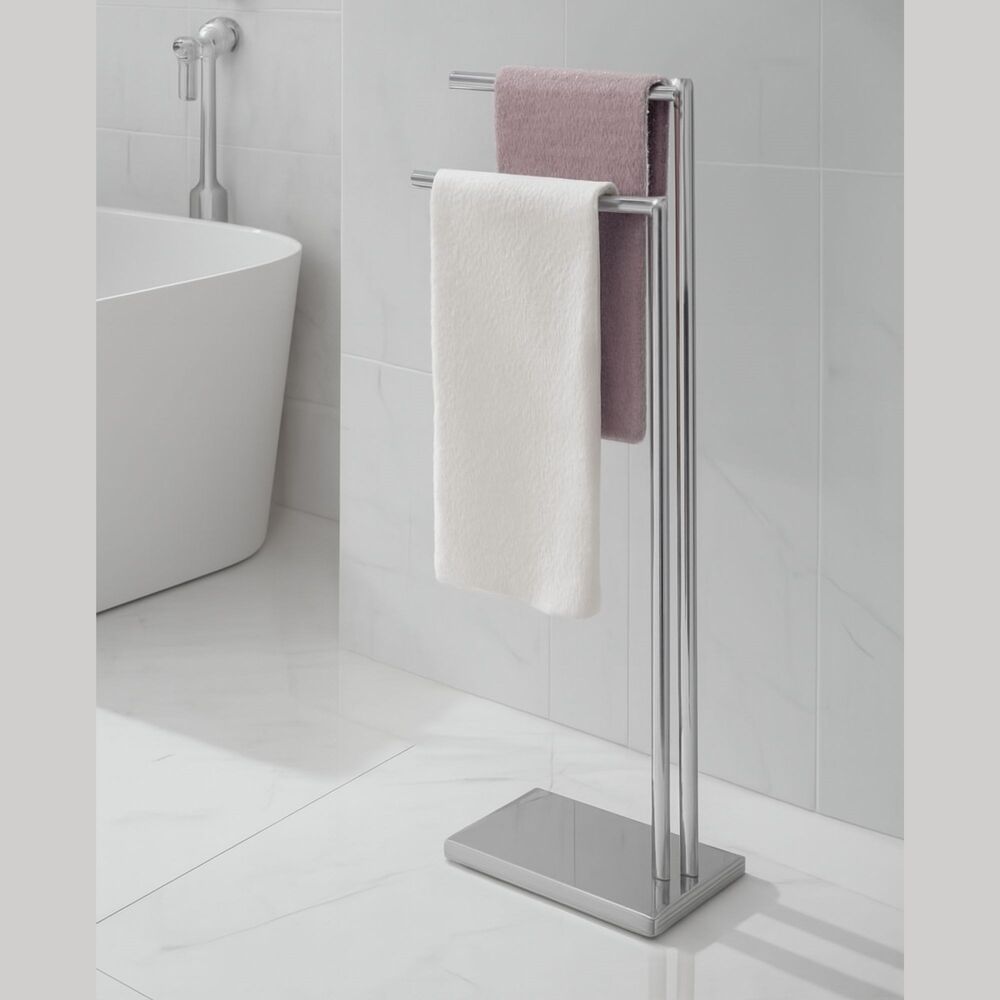 Stojací držák na ručníky s pevnou kovovou konstrukcí a stabilní základnou. Nabízí dvě ramena pro přehledné zavěšení textilií a moderní minimalistický design. Je ideální pro sušení a odkládání ručníků v koupelně, pomáhá udržet pořádek a zároveň slouží jako elegantní doplněk interiéru.