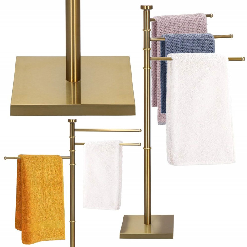 Stylový věšák na ručníky do koupelny nabízí praktické místo pro sušení ručníků i zavěšení koupelnových doplňků. Moderní kovové provedení doplňují tři ramena otočná o 360°, která umožňují pohodlné používání. Koncovky ramen brání sklouznutí textilií a stabilní základna s ochrannou podložkou chrání podlahu.