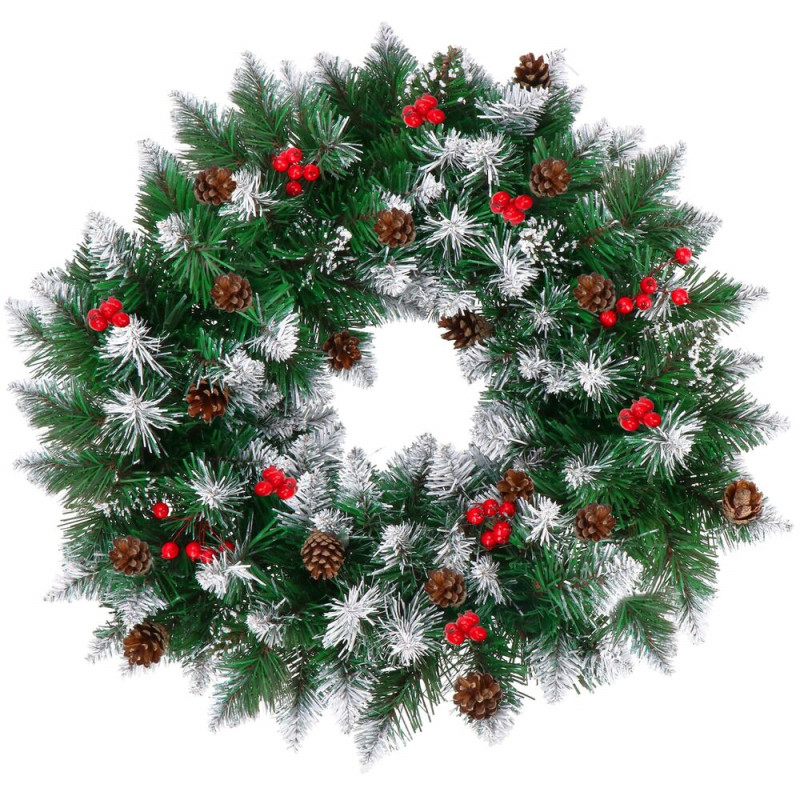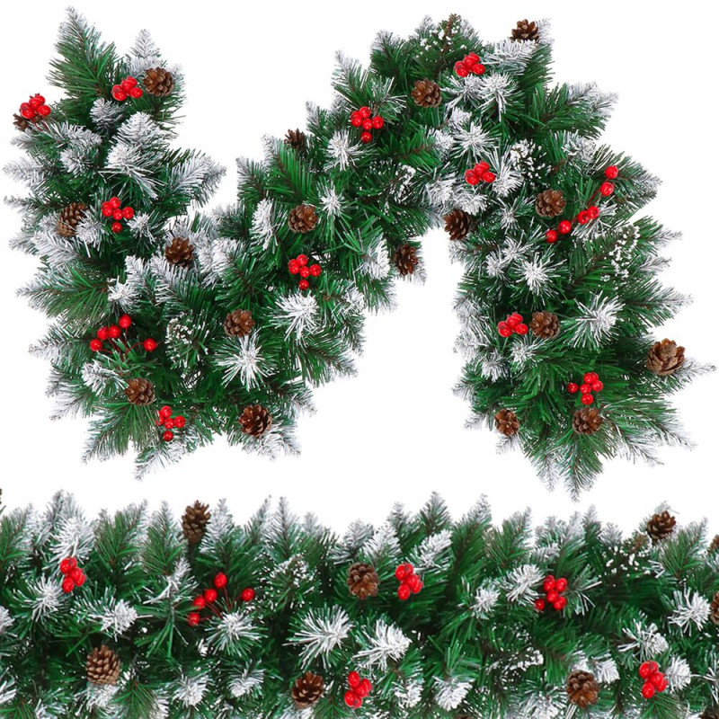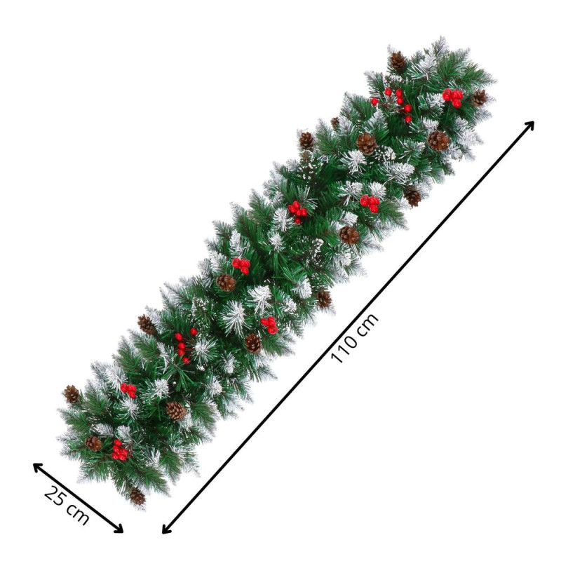 ZÁKLADNÍ ÚDAJE Značka: Springos®. Barva: zelená, s bílými, hnědými a červenými prvky. Materiál: kov, plast, přírodní šišky. Délka: 110 cm. Typ: girlanda z umělých jehličnatých větví, zasněžená, s dekoracemi. Rozměry: Celková délka: 120 cm. Délka ozdobné části s větvičkami: 110 cm. Prodloužení pro montáž: 10 cm. Délka větvičky: cca 13 cm. Šířka girlandy: cca 25 cm. Šířka jedné větve: cca 6 cm. Rozměry kužele: cca 5 x 3 cm (šišky jsou přírodní, jejich rozměry se mohou lišit). Průměr jeřábu: 11 mm. Další informace: Girlanda má umělé jehličnaté větve s PVC jehlicemi a dekorace: přírodní šišky a umělý jasan.. Špičky větví jsou pokryty bílou barvou imitující sníh, některé větve jsou navíc pokryty třpytkami.