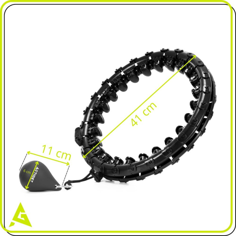Masážní fitness obruč se závažím pro efektivní tvarování postavy a rychlejší spalování tuků. Nastavitelný obvod 50–120 cm. Nastavitelná délka a hmotnost závaží do 340 g. Závaží na kuličkových ložiscích pro plynulý pohyb. 24 masážních prvků pro intenzivní stimulaci svalů a vyšší účinnost tréninku.
